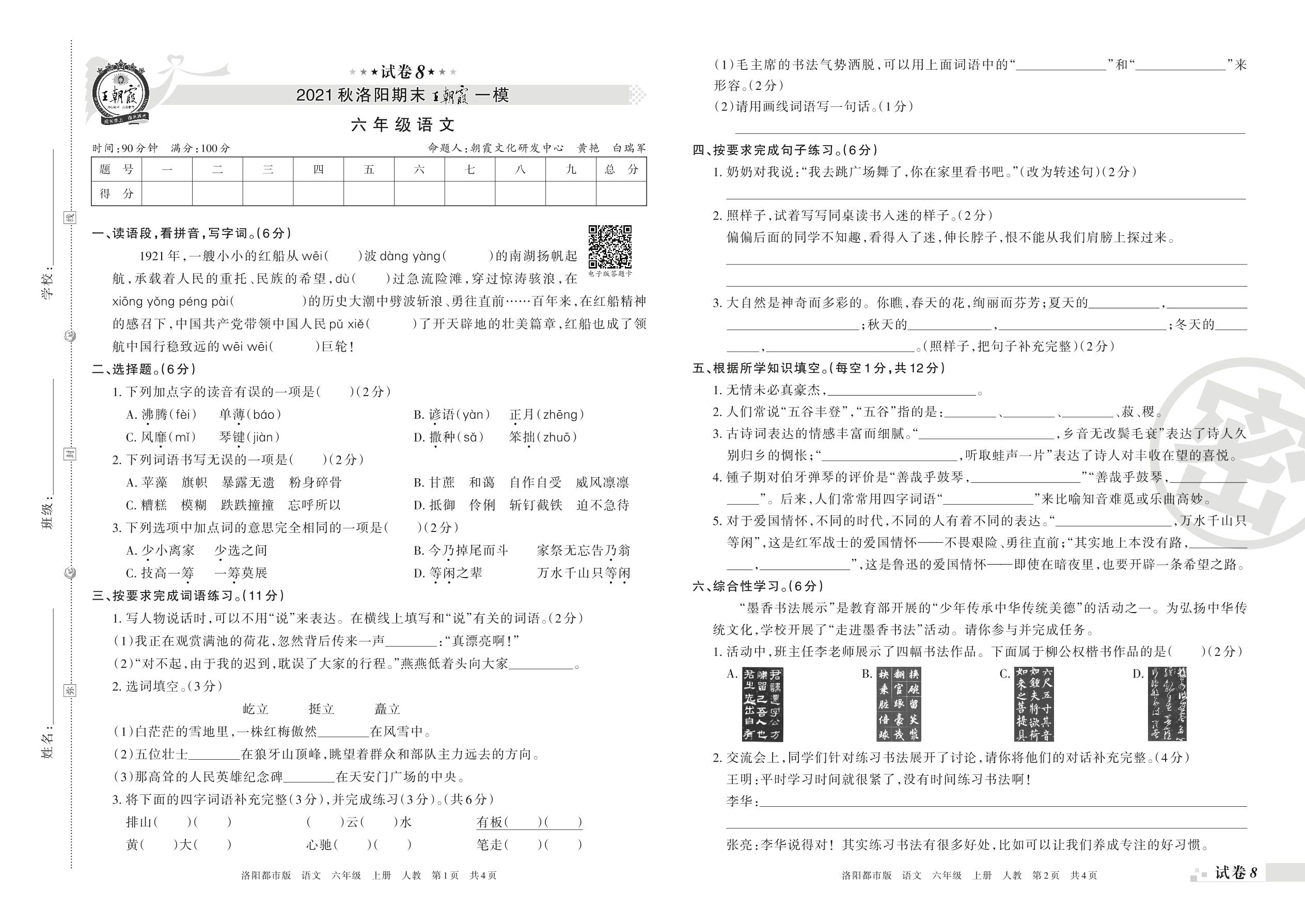 王朝霞期末模拟卷六年级上册语文(人教版)_R211224113144438【8】