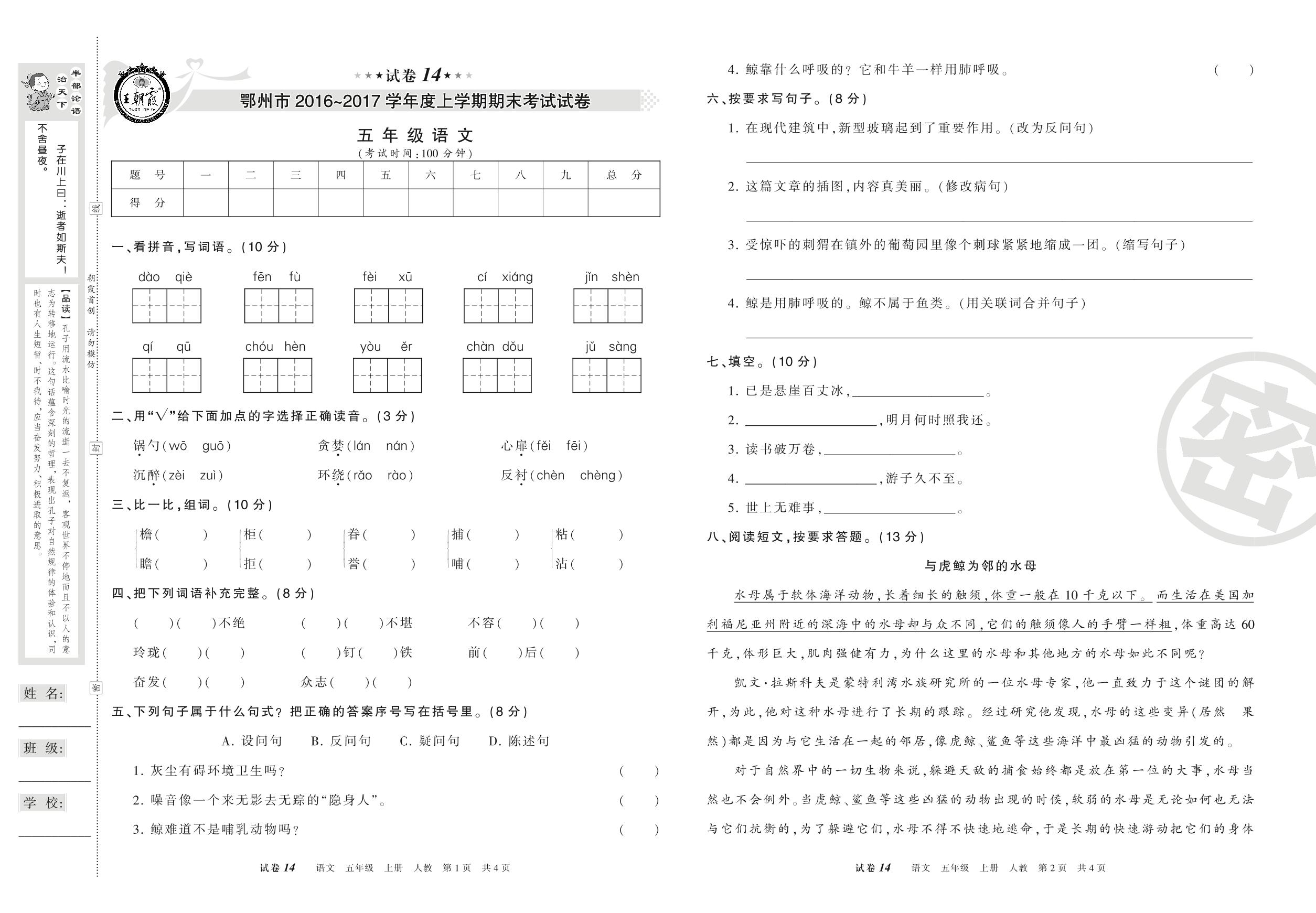 2016-2017学年第一学期鄂州市五年级语文试卷(人教版)【14】