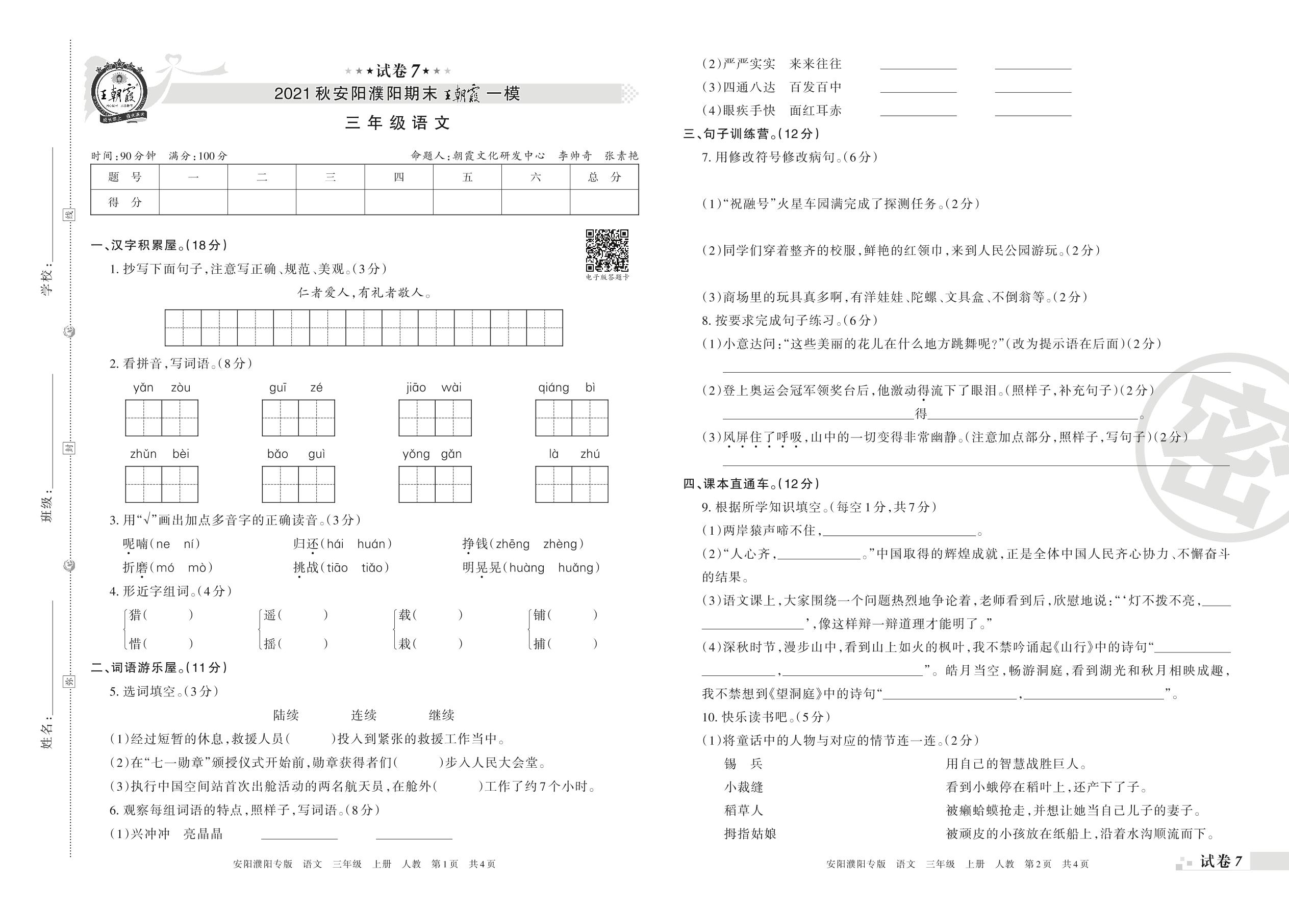 王朝霞期末模拟卷三年级上册语文(人教版)_R211224113622991【7】