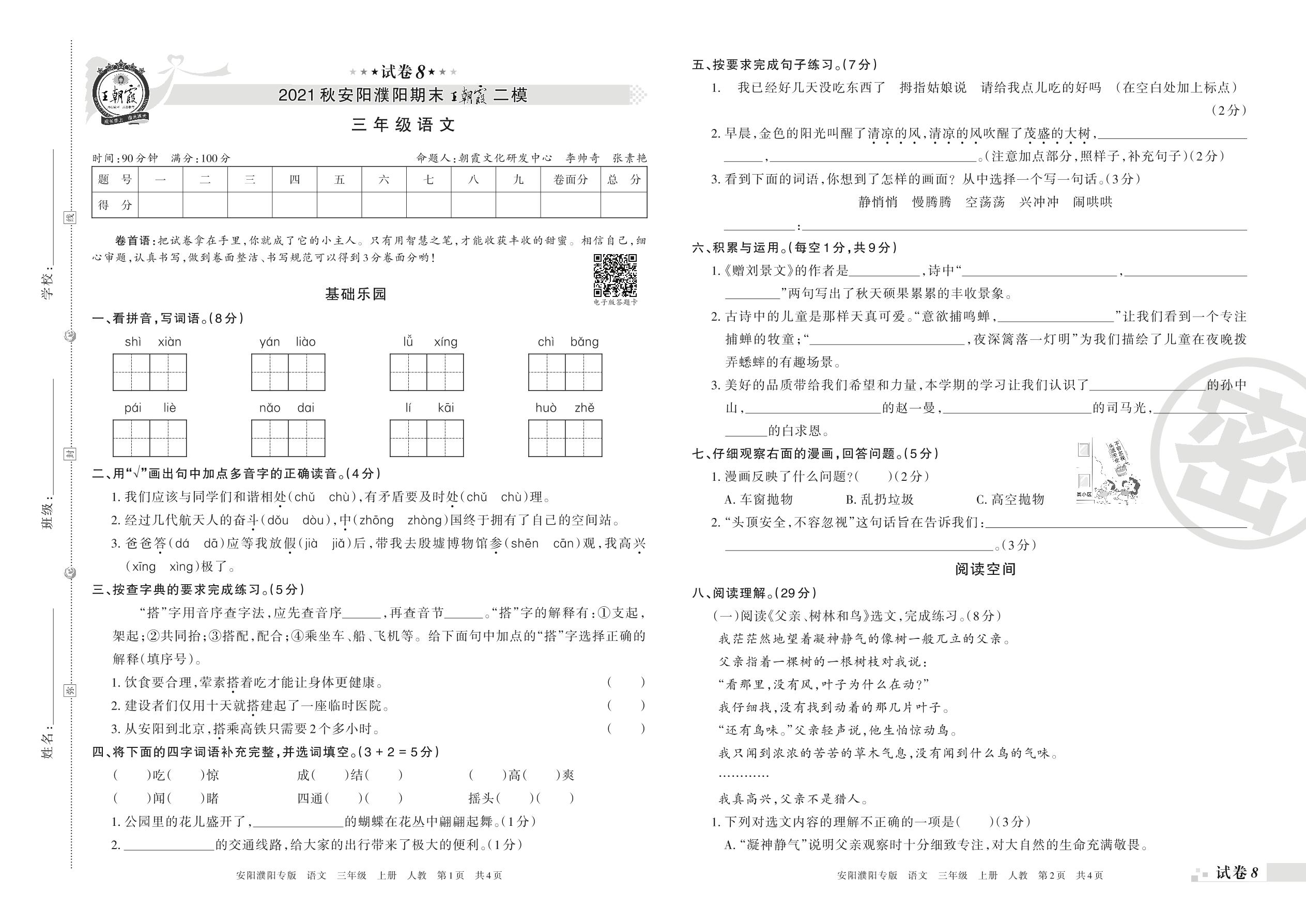 王朝霞期末模拟卷三年级上册语文(人教版)_R211224113623928【8】
