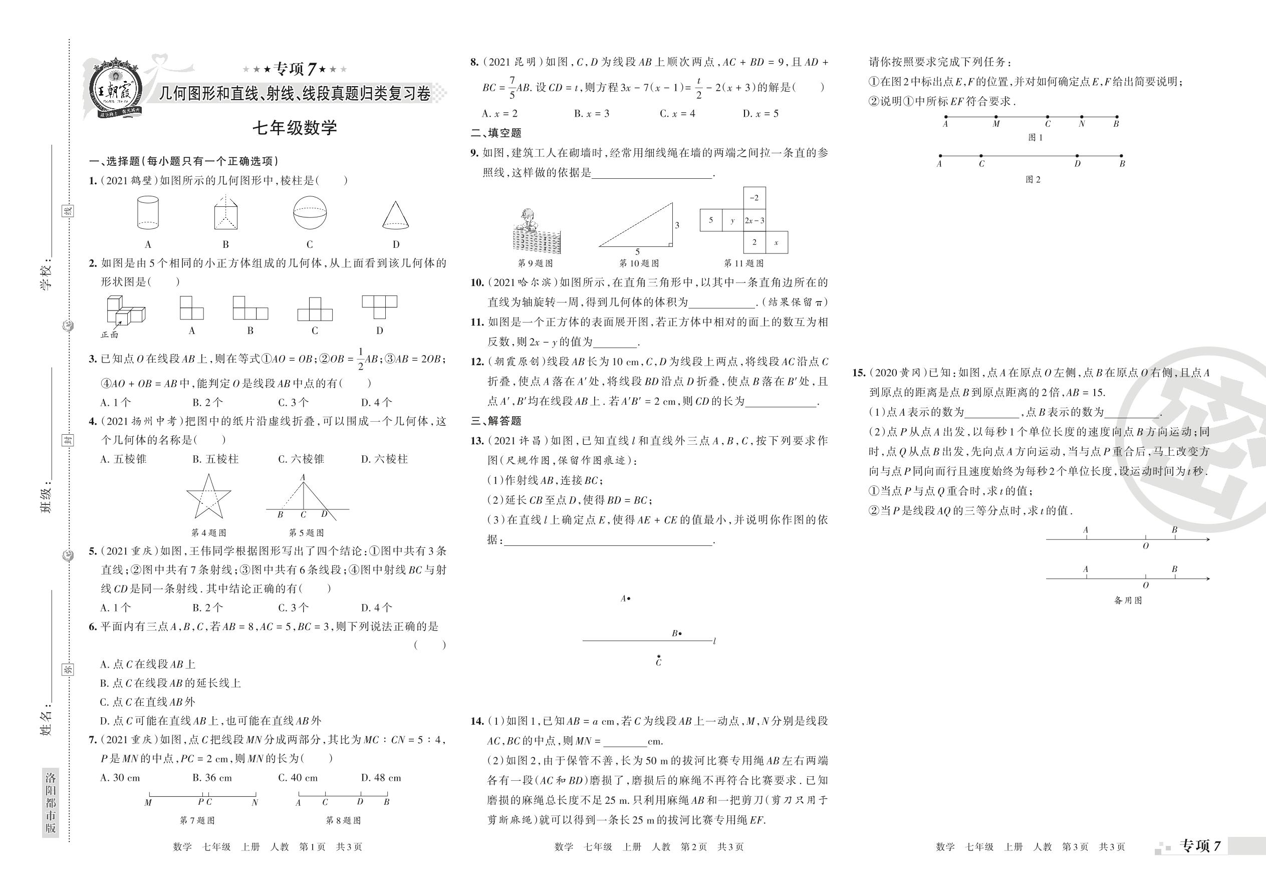 王朝霞期末专项卷——几何图形和直线、射线、线段真题归类复习卷七年级上册数学(人教版)_R211224114053754【7】