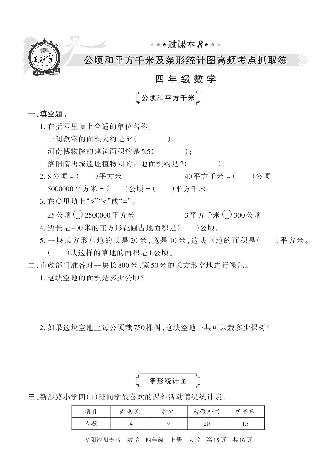 王朝霞期末过课本——公顷和平方千米及条形统计图高频考点抓取练四年级上册数学(人教版)【8】