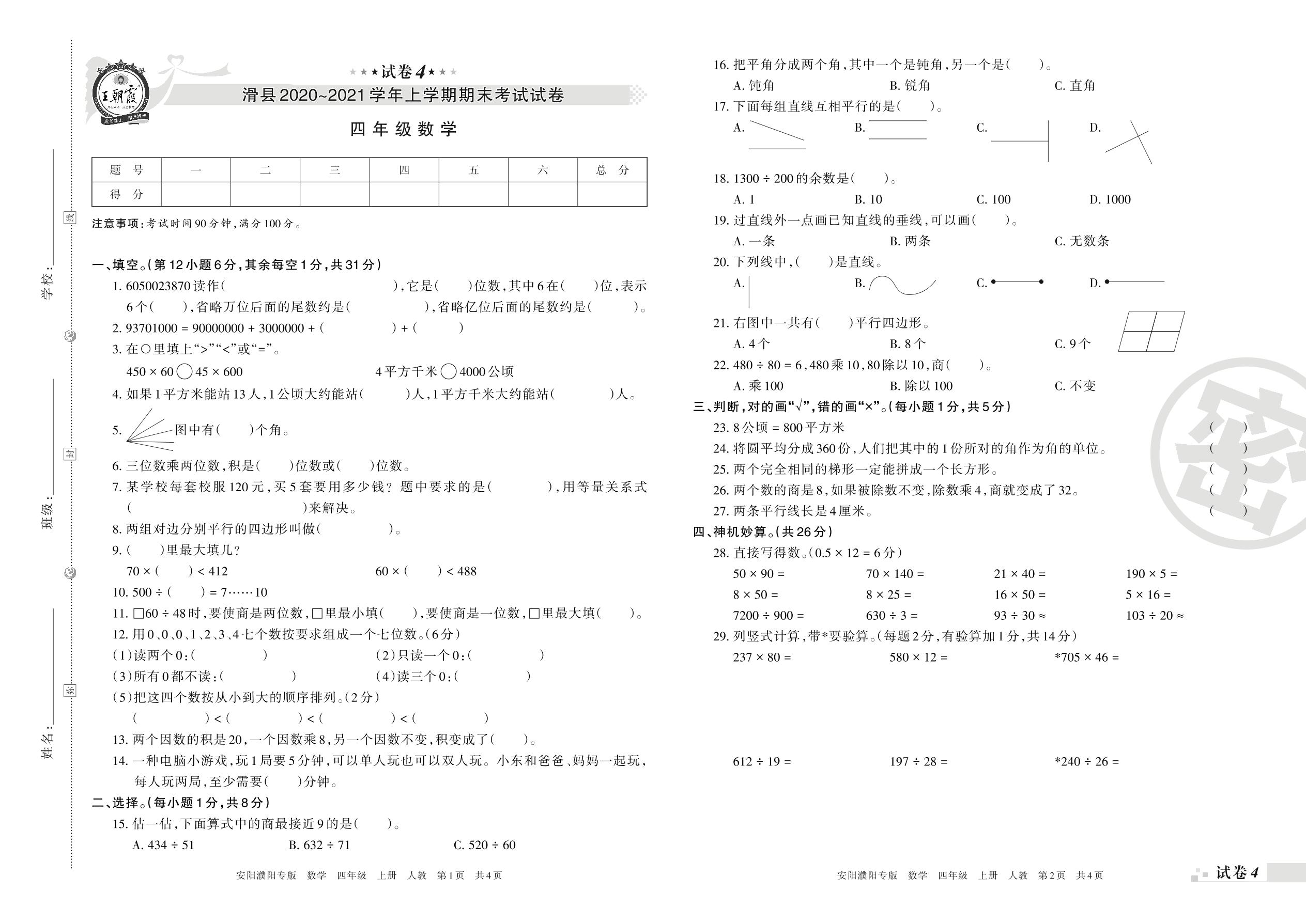滑县2020~2021学年上学期期末考试试卷四年级数学(人教版)【4】