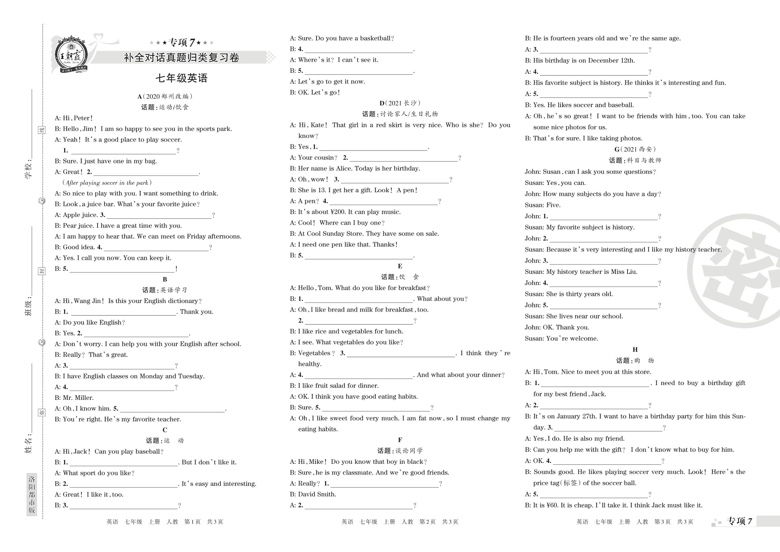 王朝霞期末专项卷——补全对话真题归类复习卷七年级上册英语(人教版)_R211224120047689【7】