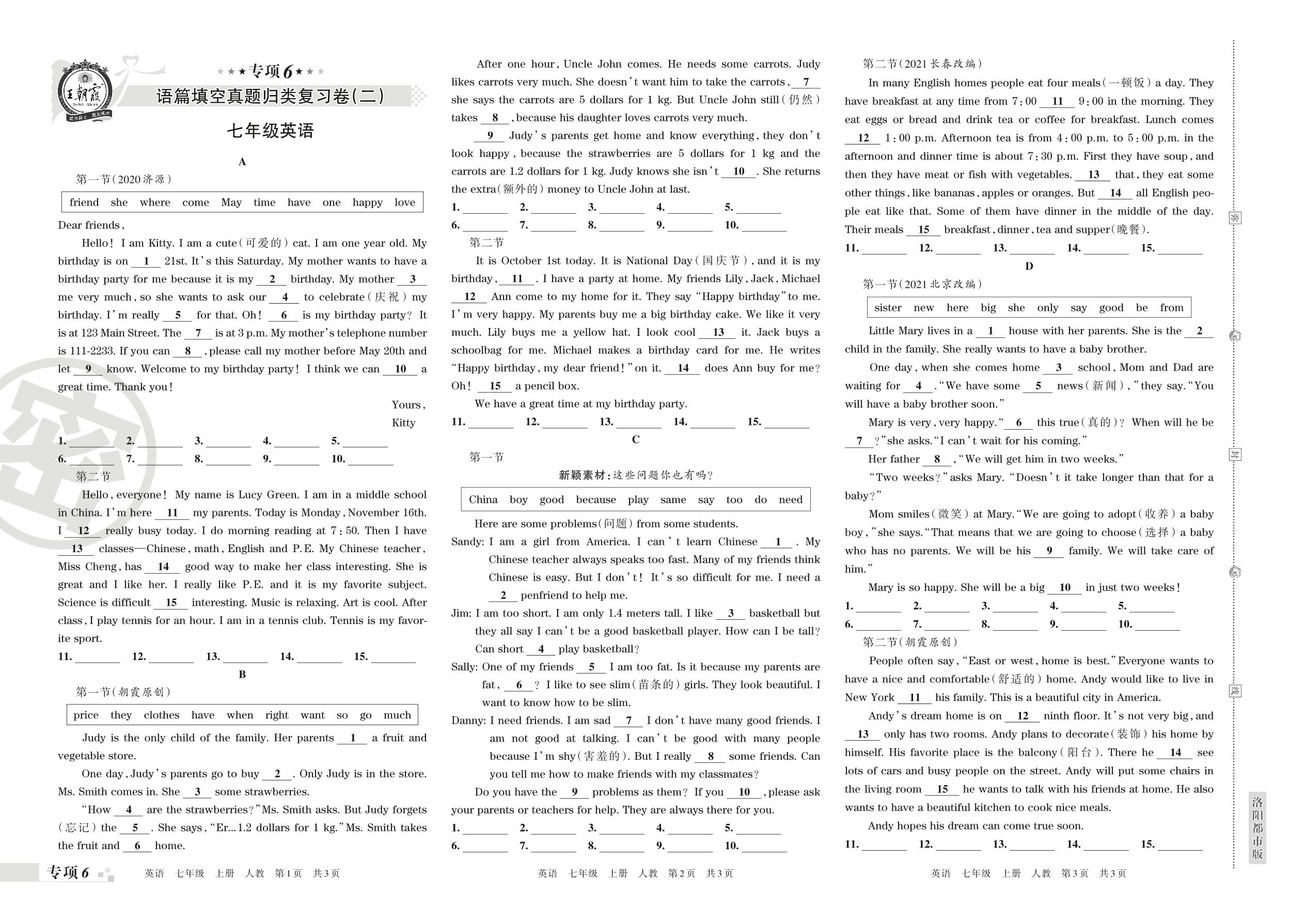 王朝霞期末专项卷——语篇填空真题归类复习卷(二)七年级上册英语(人教版)_R211224120047852【6】