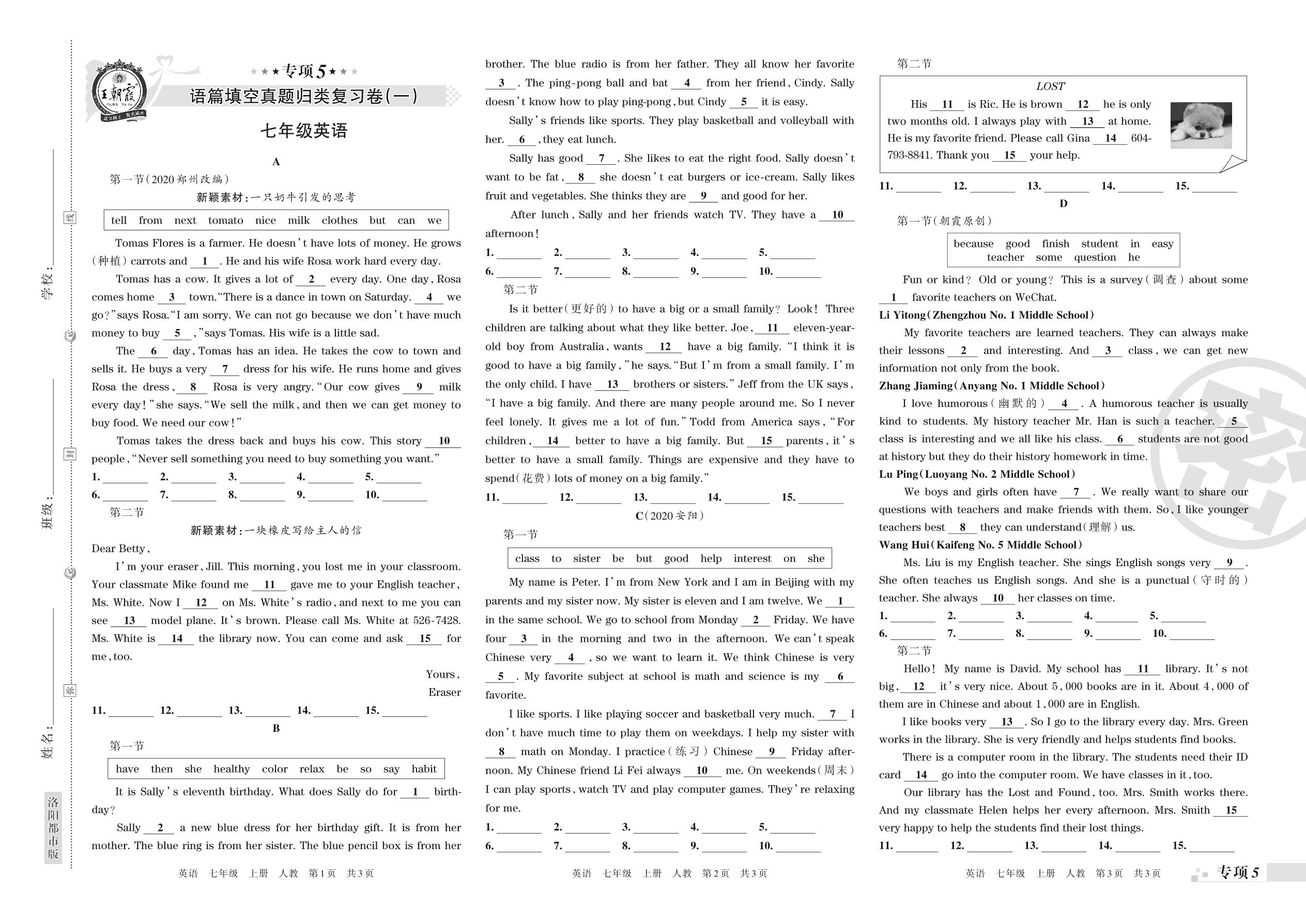 王朝霞期末专项卷——语篇填空真题归类复习卷(一)七年级上册英语(人教版)_R211224120047238【5】