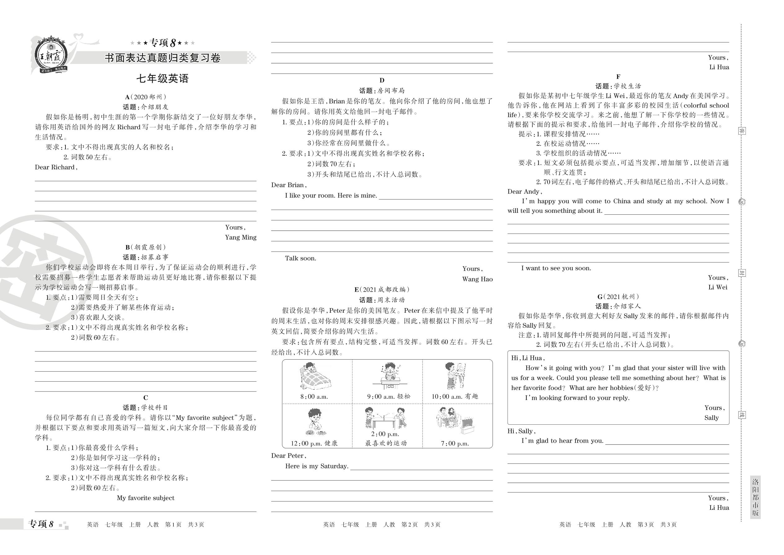 王朝霞期末专项卷——书面表达真题归类复习卷七年级上册英语(人教版)_R211224120047707【8】