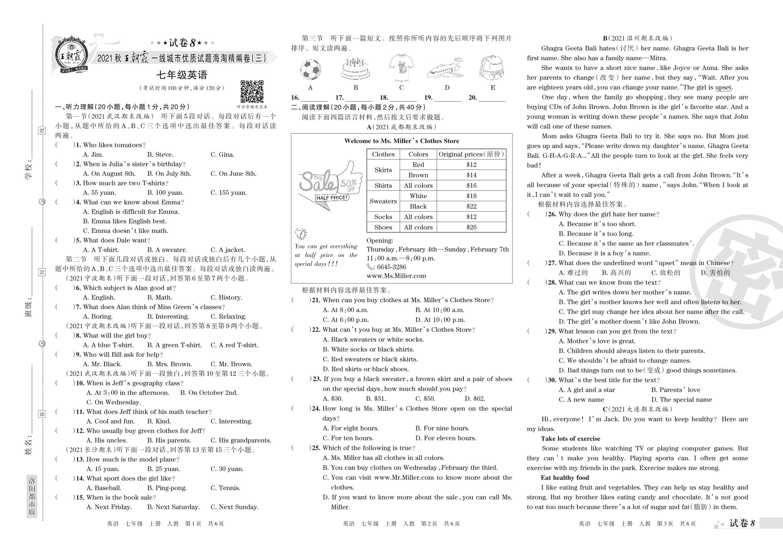 2021秋王朝霞一线城市优质试题海淘精编卷(三)七年级英语(人教版)【8】