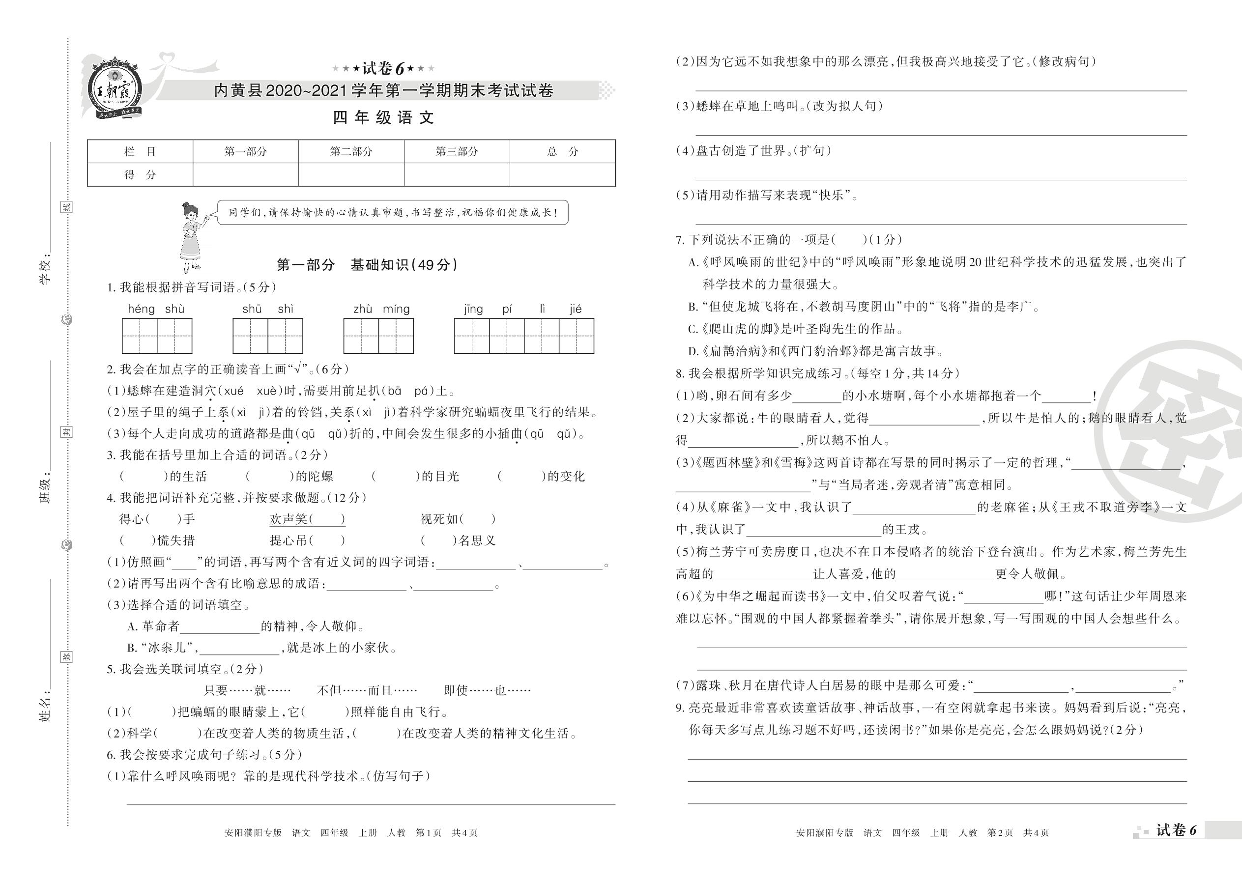 内黄县2020~2021学年第一学期期末考试试卷四年级语文(人教版)【6】