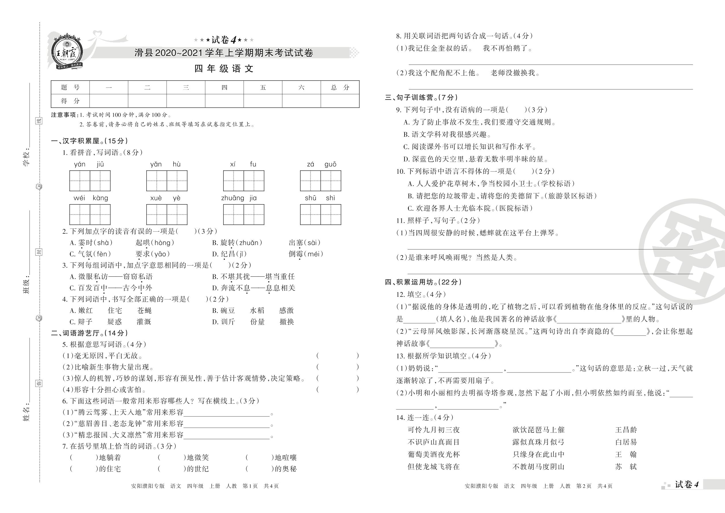 滑县2020~2021学年上学期期末考试试卷四年级语文(人教版)【4】