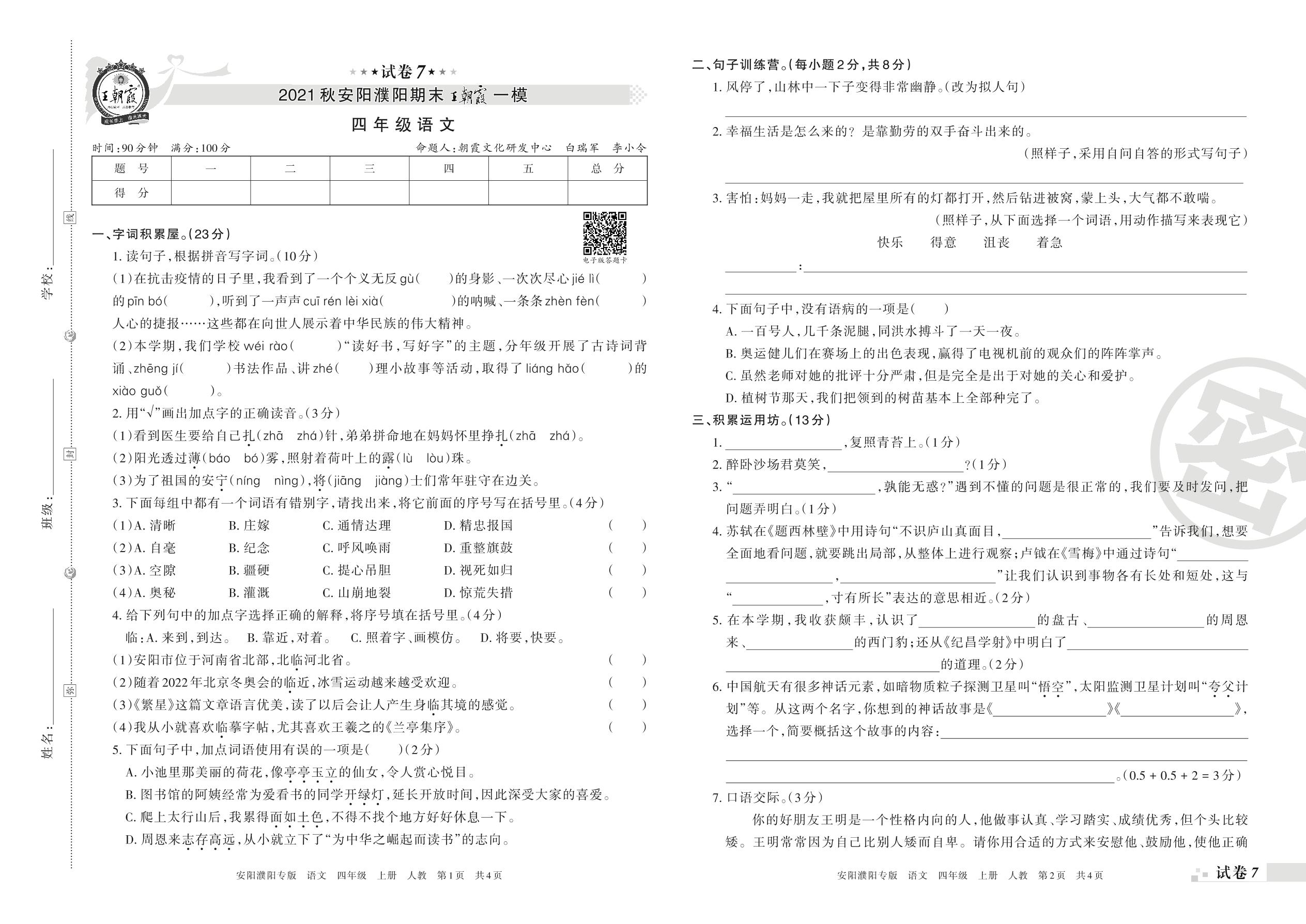 王朝霞期末模拟卷四年级上册语文(人教版)_R211224134623966【7】