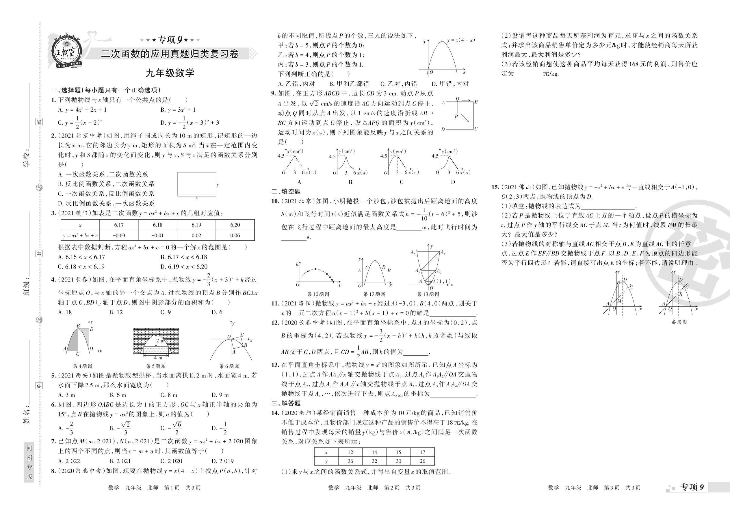 2021-2022学年第一学期王朝霞期末专项卷——二次函数的应用真题归类复习卷九年级数学(北师版)【9】