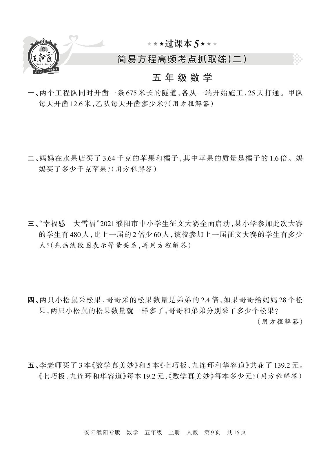 王朝霞期末过课本——简易方程高频考点抓取练(二)五年级上册数学(人教版)【5】
