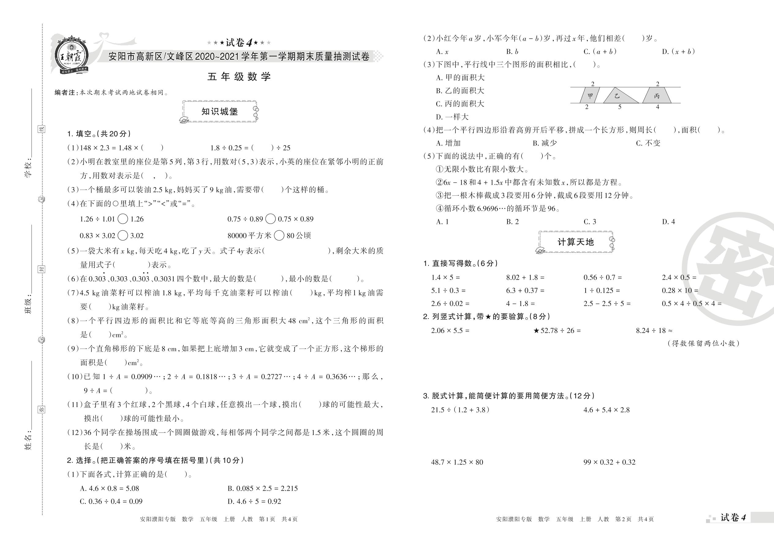安阳市高新区、文峰区2020~2021学年第一学期期末质量抽测试卷五年级数学(人教版)【4】