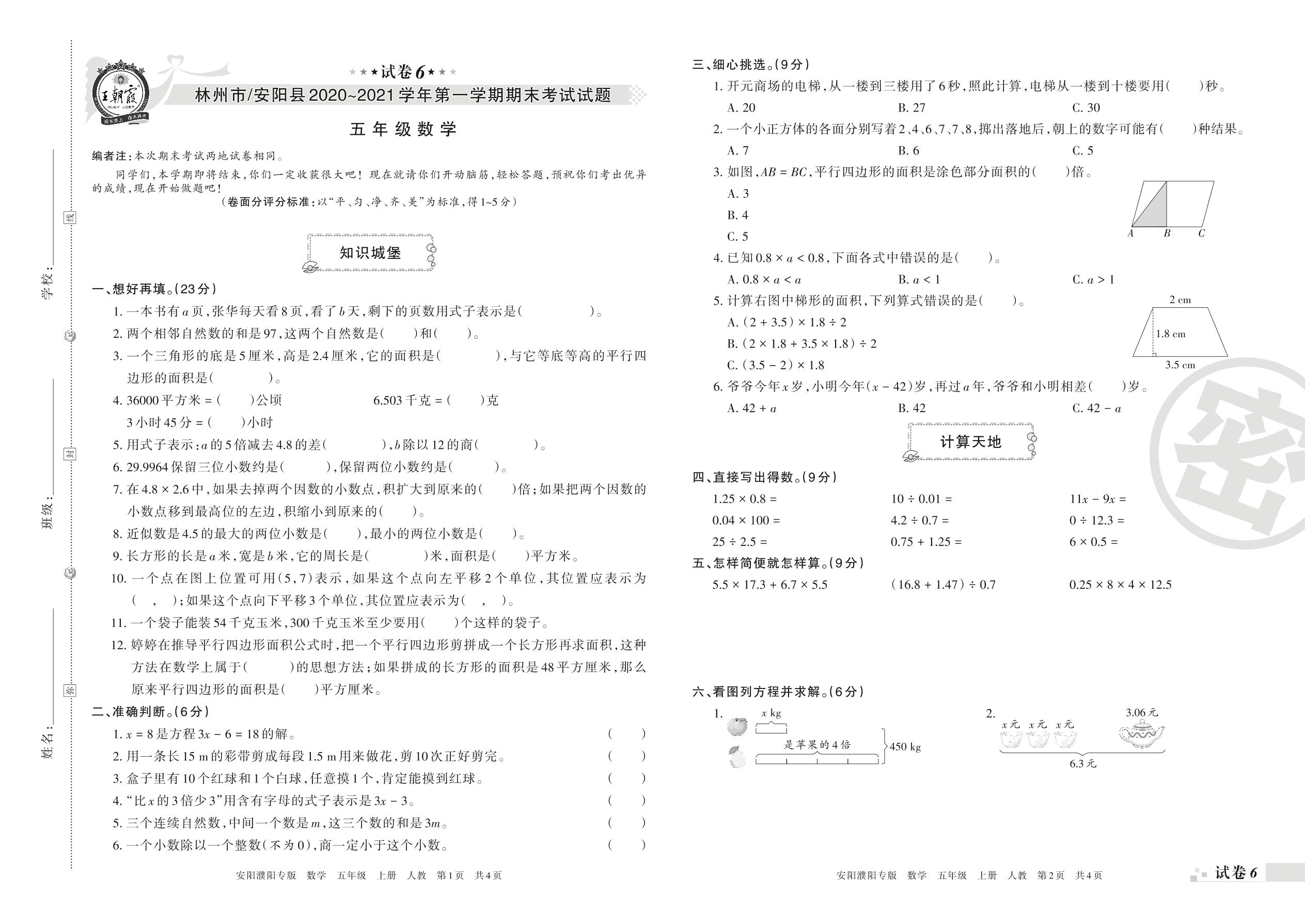 林州市、安阳县2020~2021学年第一学期期末考试试题五年级数学(人教版)【6】