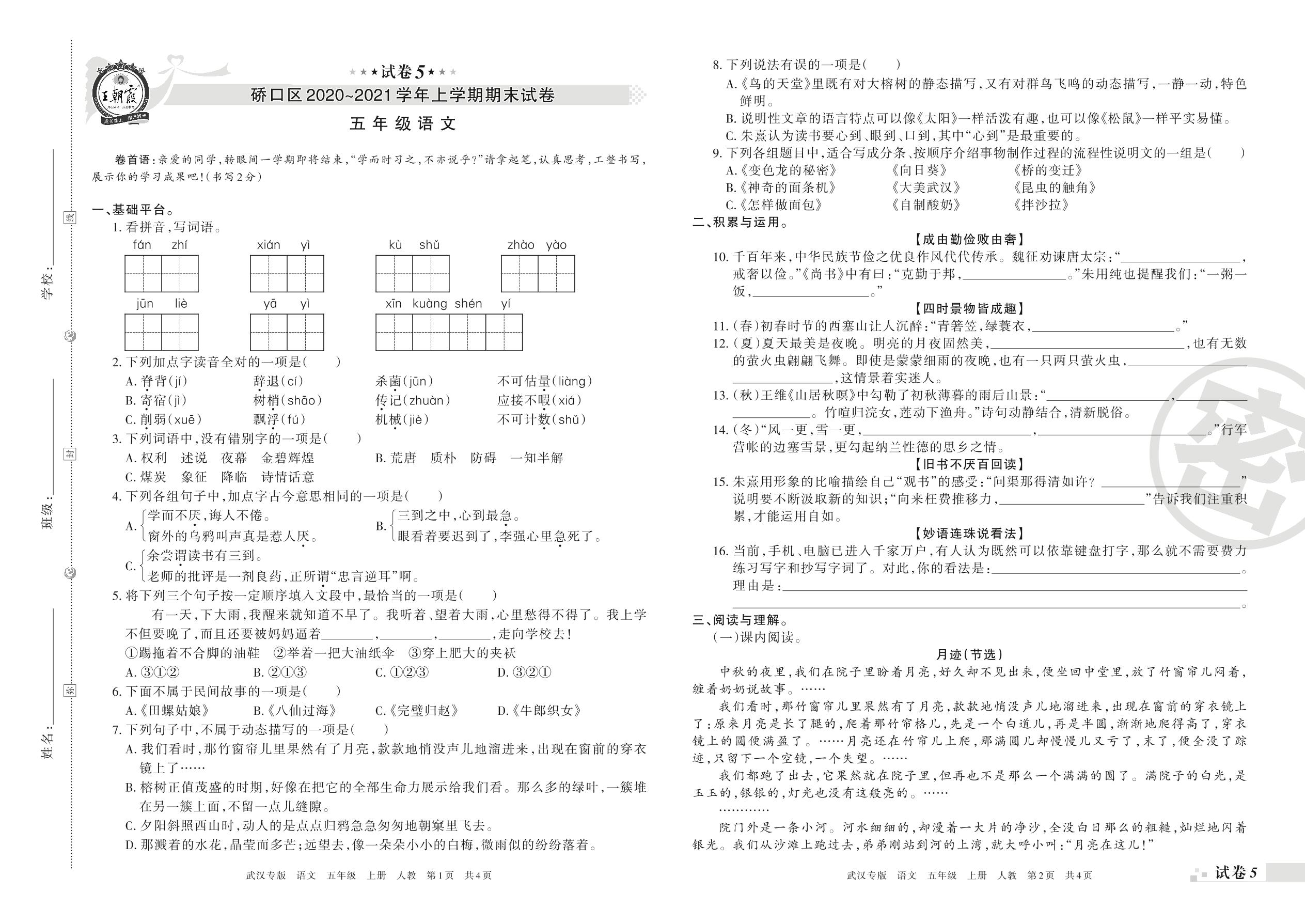 硚口区2020~2021学年上学期期末试卷五年级语文(人教版)【5】