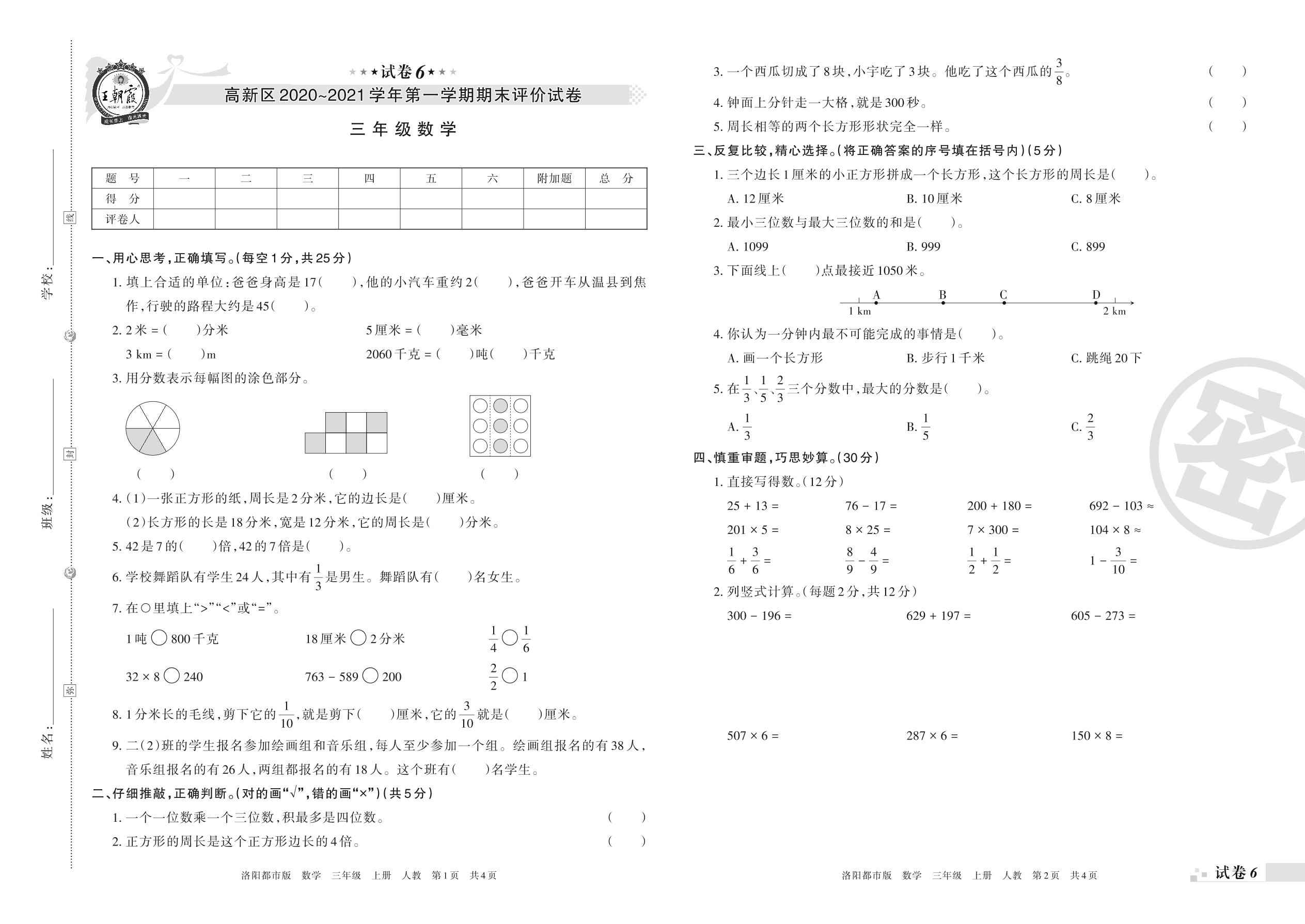 高新区2020~2021学年第一学期期末评价试卷三年级数学(人教版)【6】