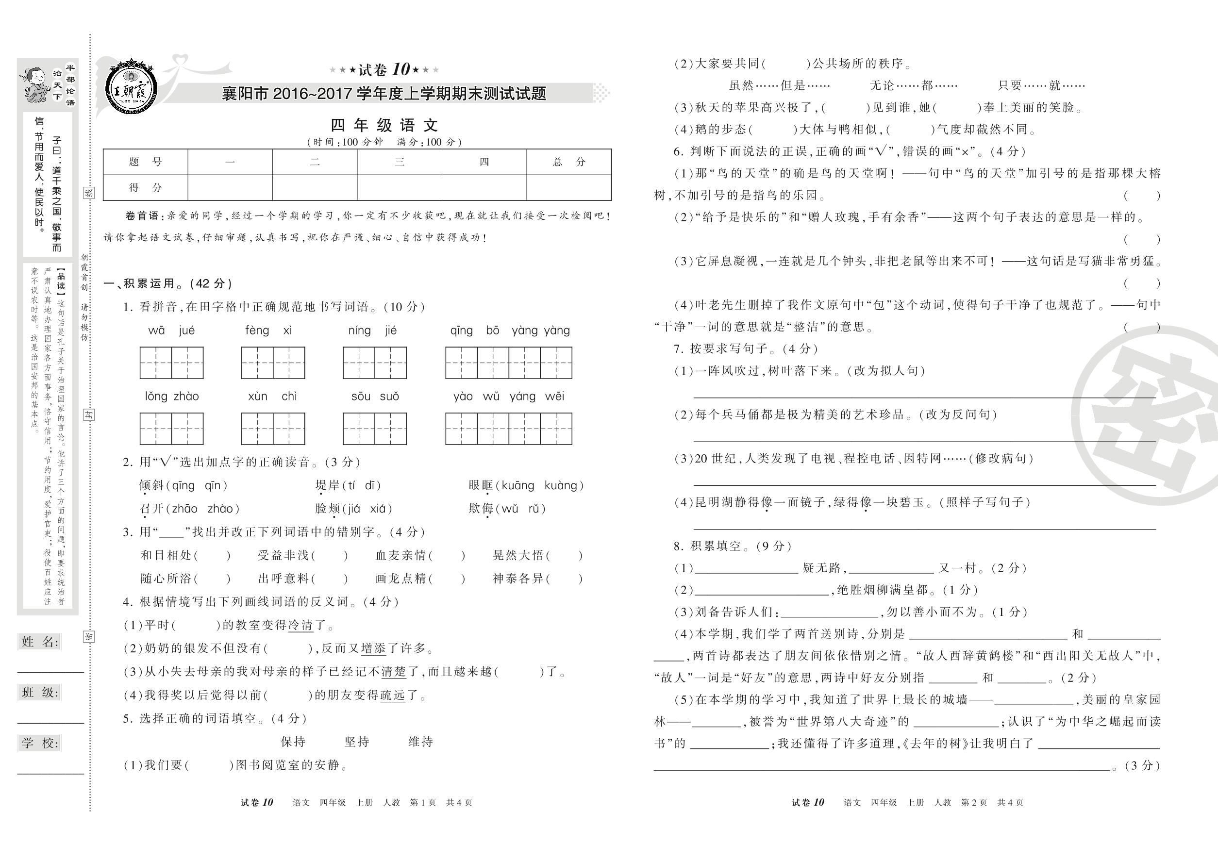 2016-2017学年第一学期襄阳市四年级语文试卷(人教版)【10】