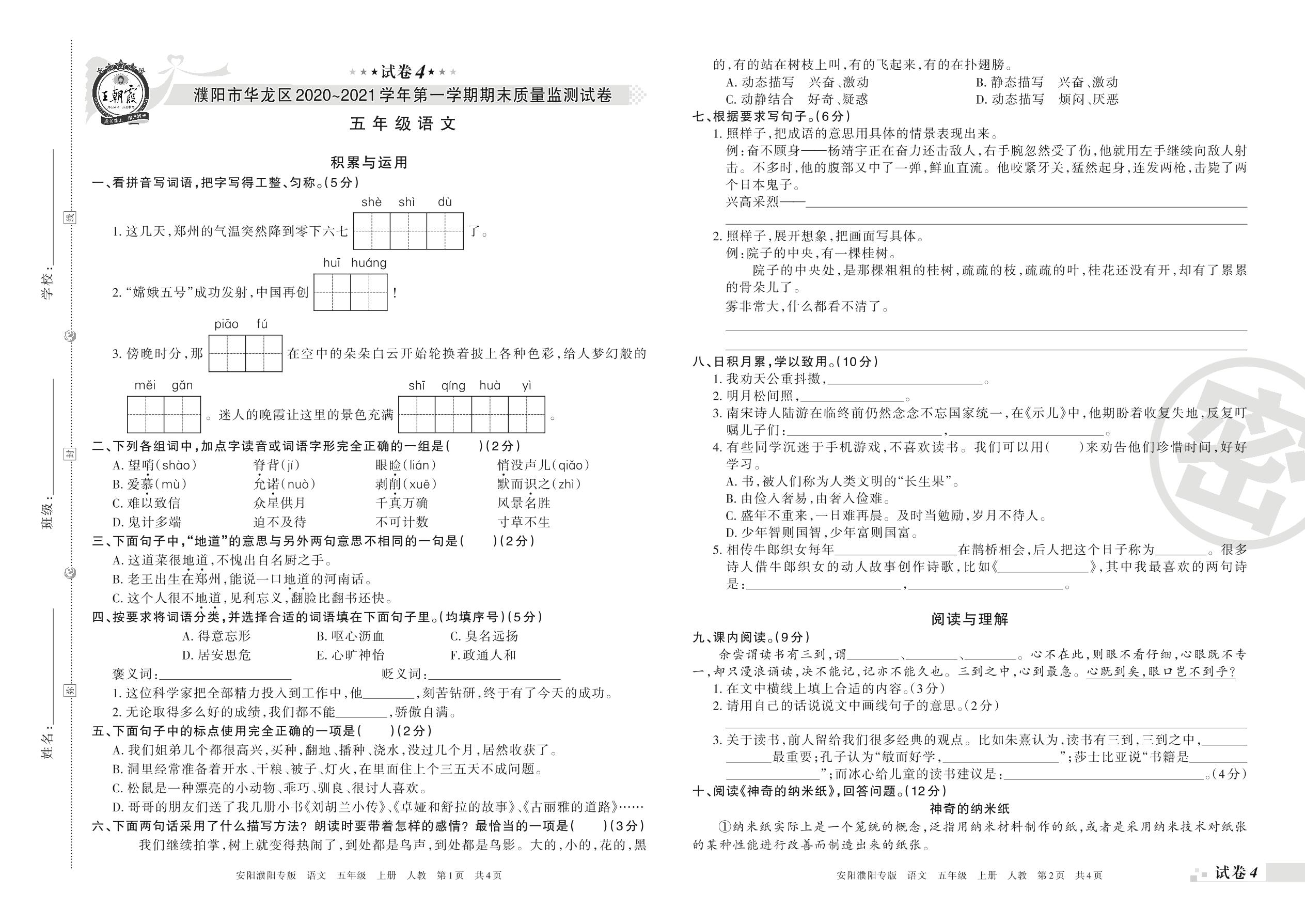 濮阳市华龙区2020~2021学年第一学期期末质量监测试卷五年级语文(人教版)【4】