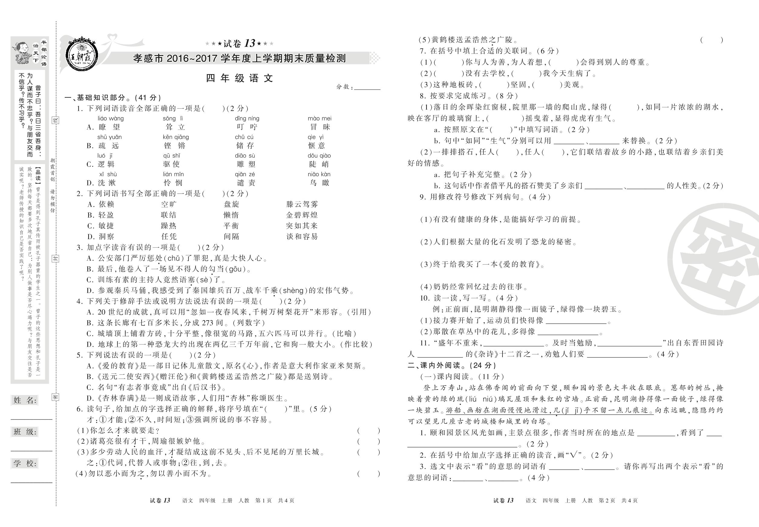 2016-2017学年第一学期孝感市四年级语文试卷(人教版)【13】