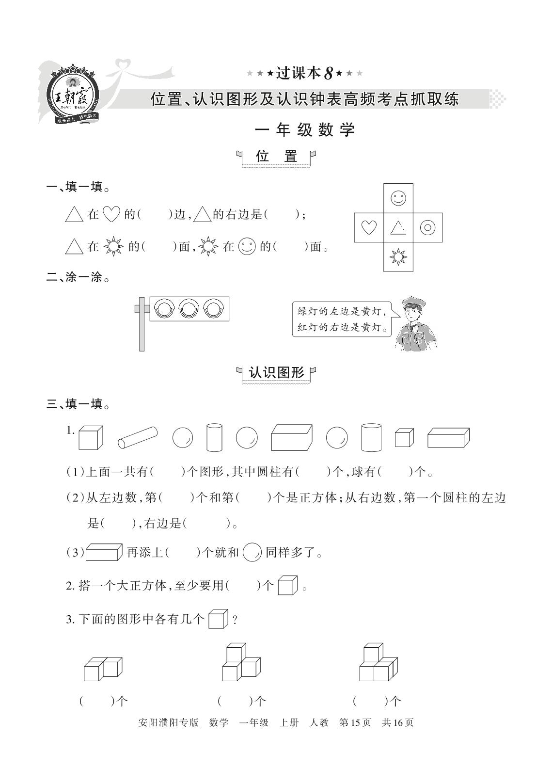 王朝霞期末过课本——位置、认识图形及认识钟表高频考点抓取练一年级上册数学(人教版)【8】