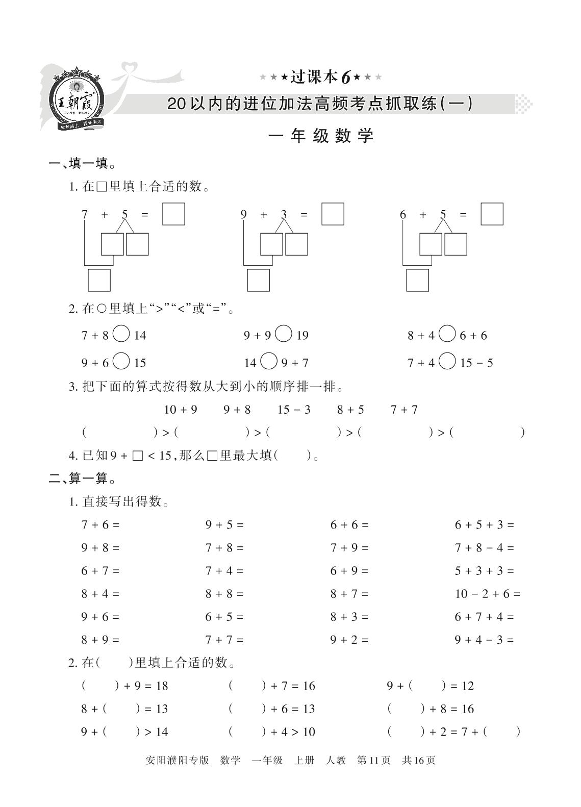 王朝霞期末过课本——20以内的进位加法高频考点抓取练(一)一年级上册数学(人教版)_R211224140321493【6】