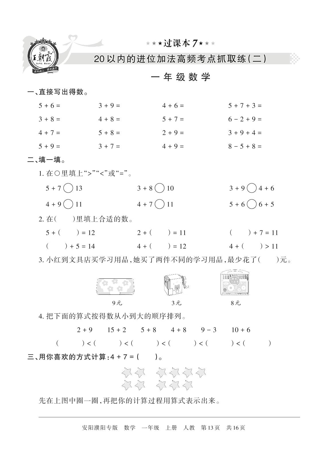 王朝霞期末过课本——20以内的进位加法高频考点抓取练(二)一年级上册数学(人教版)_R211224140321865【7】