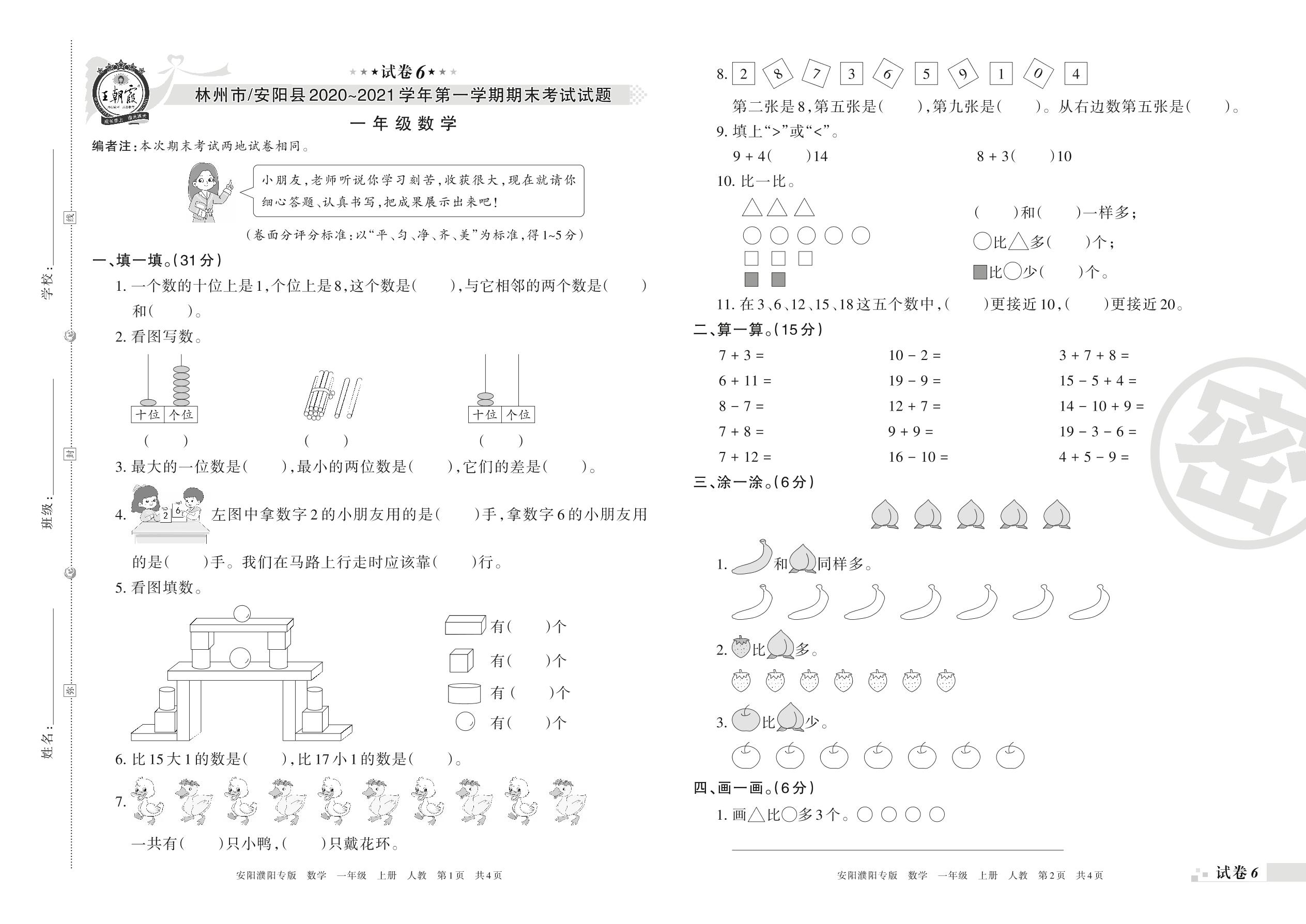 林州市、安阳县2020~2021学年第一学期期末考试试题一年级数学(人教版)【6】