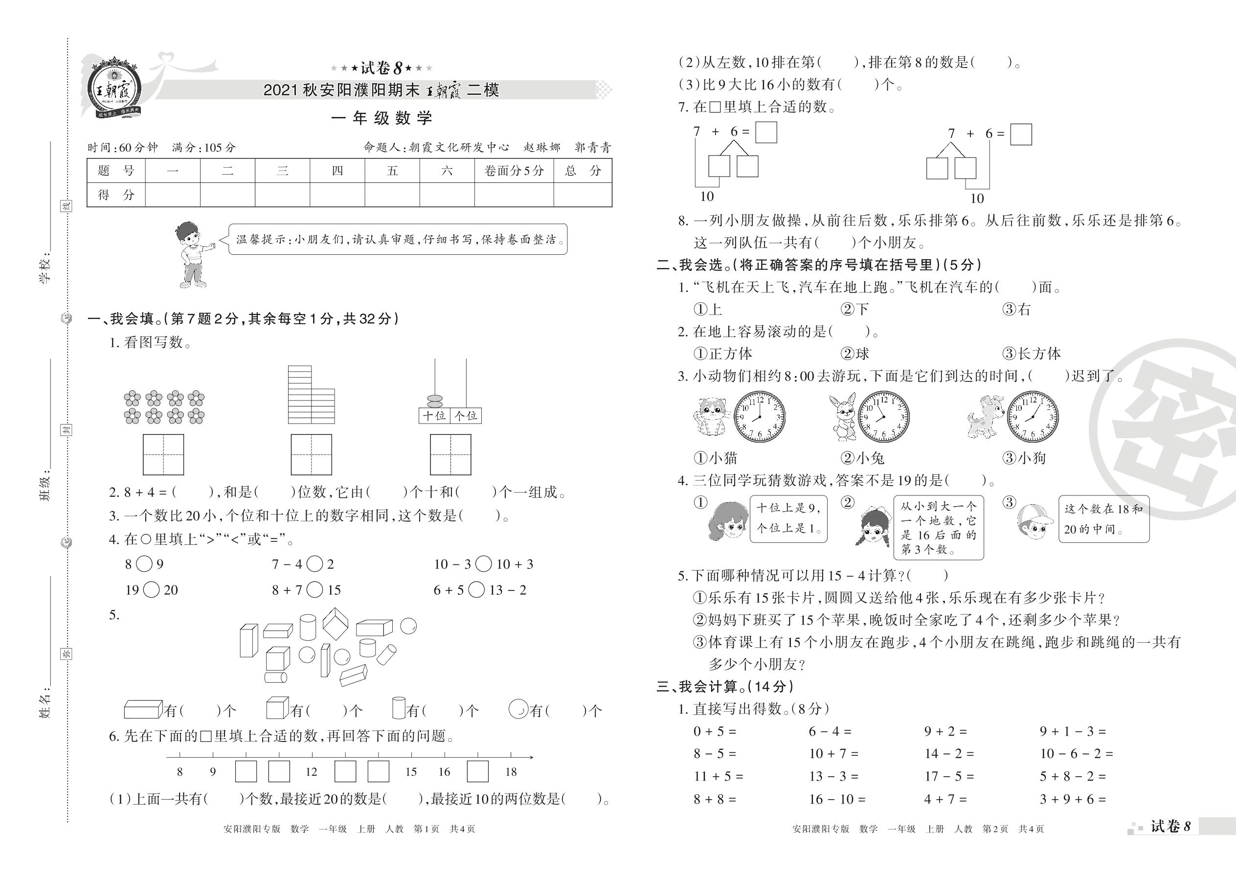 王朝霞期末模拟卷一年级上册数学(人教版)_R211224140321473【8】