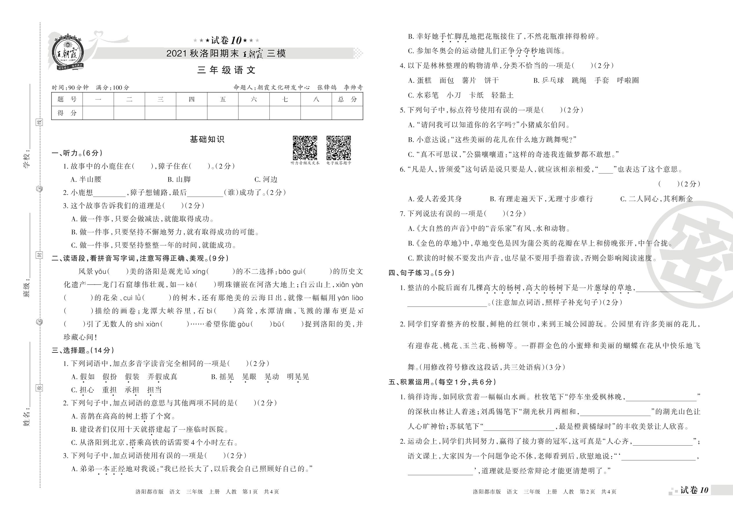 王朝霞期末模拟卷三年级上册语文(人教版)_R211224140400056【10】