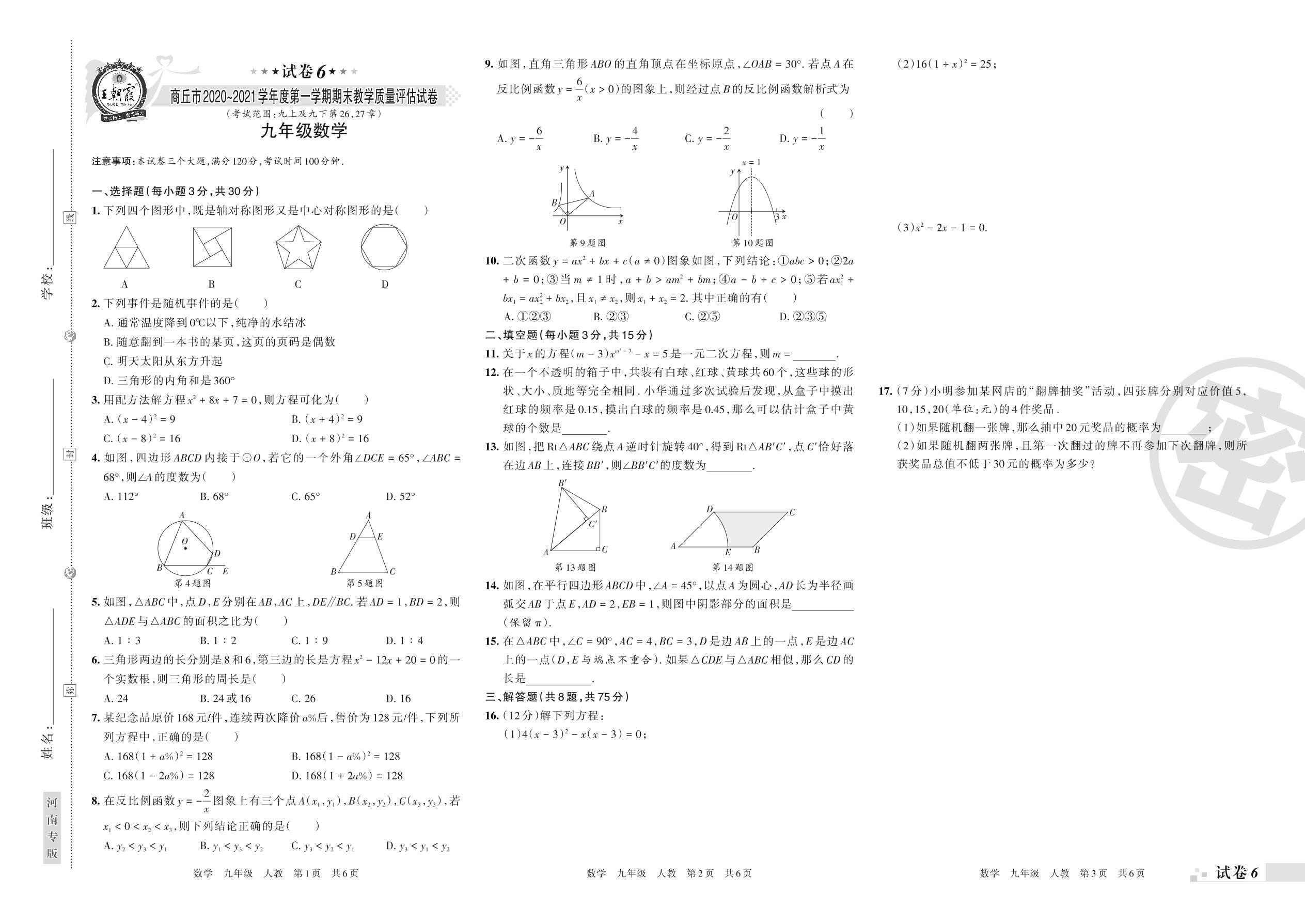 商丘市2020~2021学年度第一学期期末教学质量评估试卷九年级数学(人教版)【6】