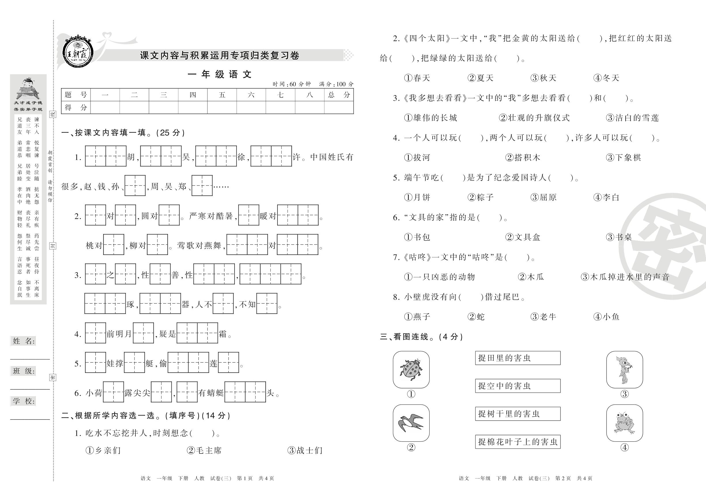 王朝霞期末专项卷一年级下册语文(人教版)_R210731182111【3】