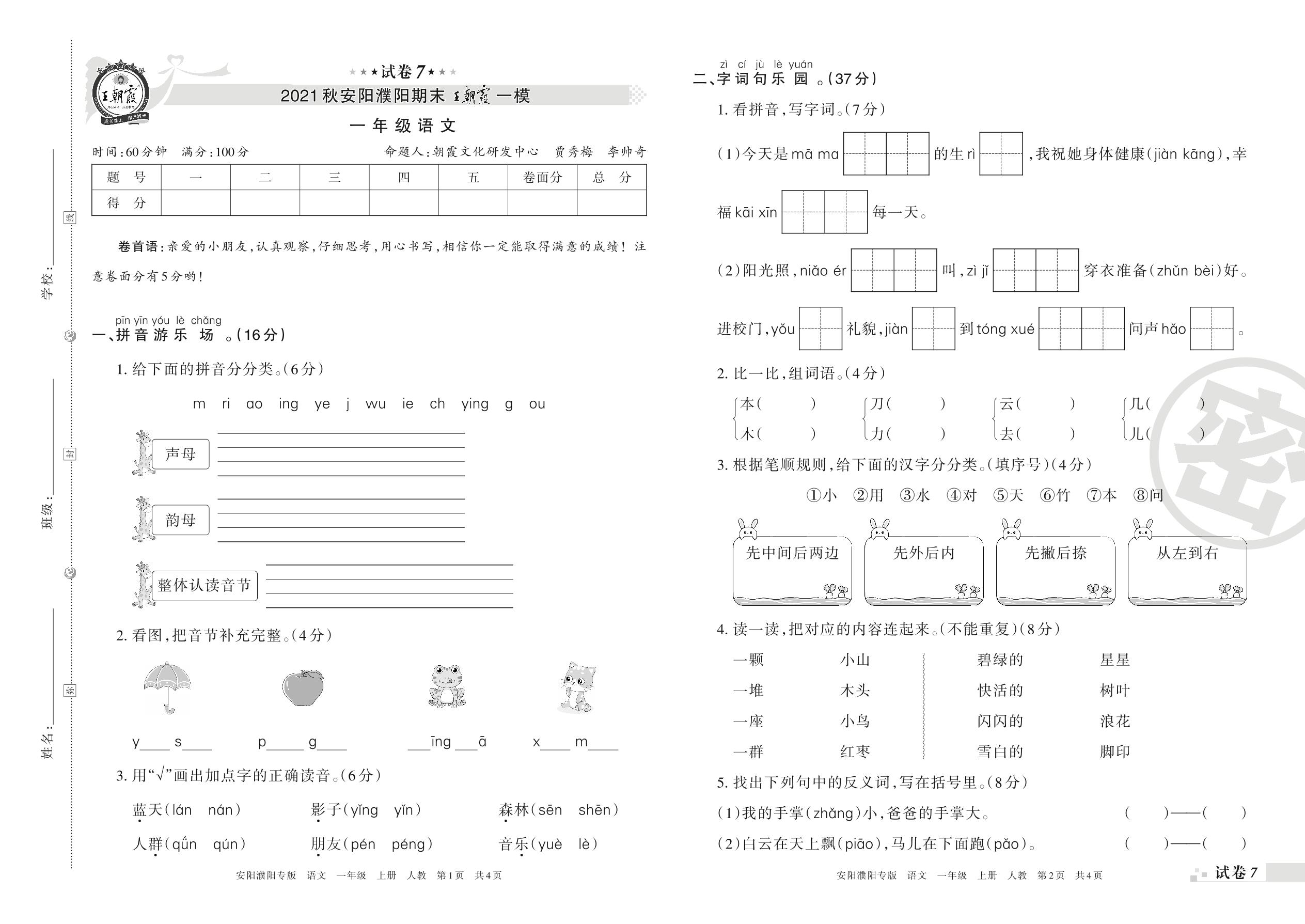 王朝霞期末模拟卷一年级上册语文(人教版)_R211224141001384【7】