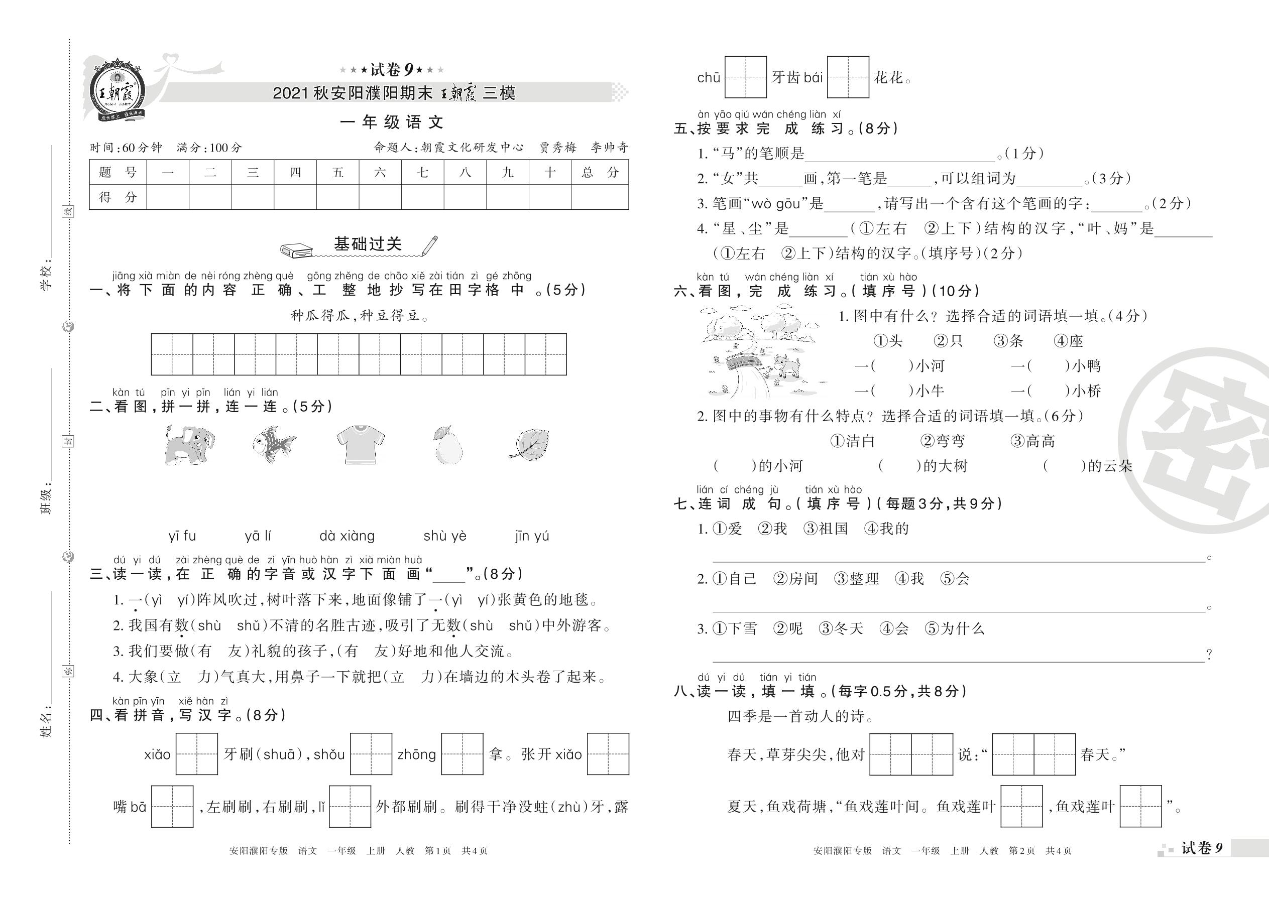 王朝霞期末模拟卷一年级上册语文(人教版)_R211224141001634【9】