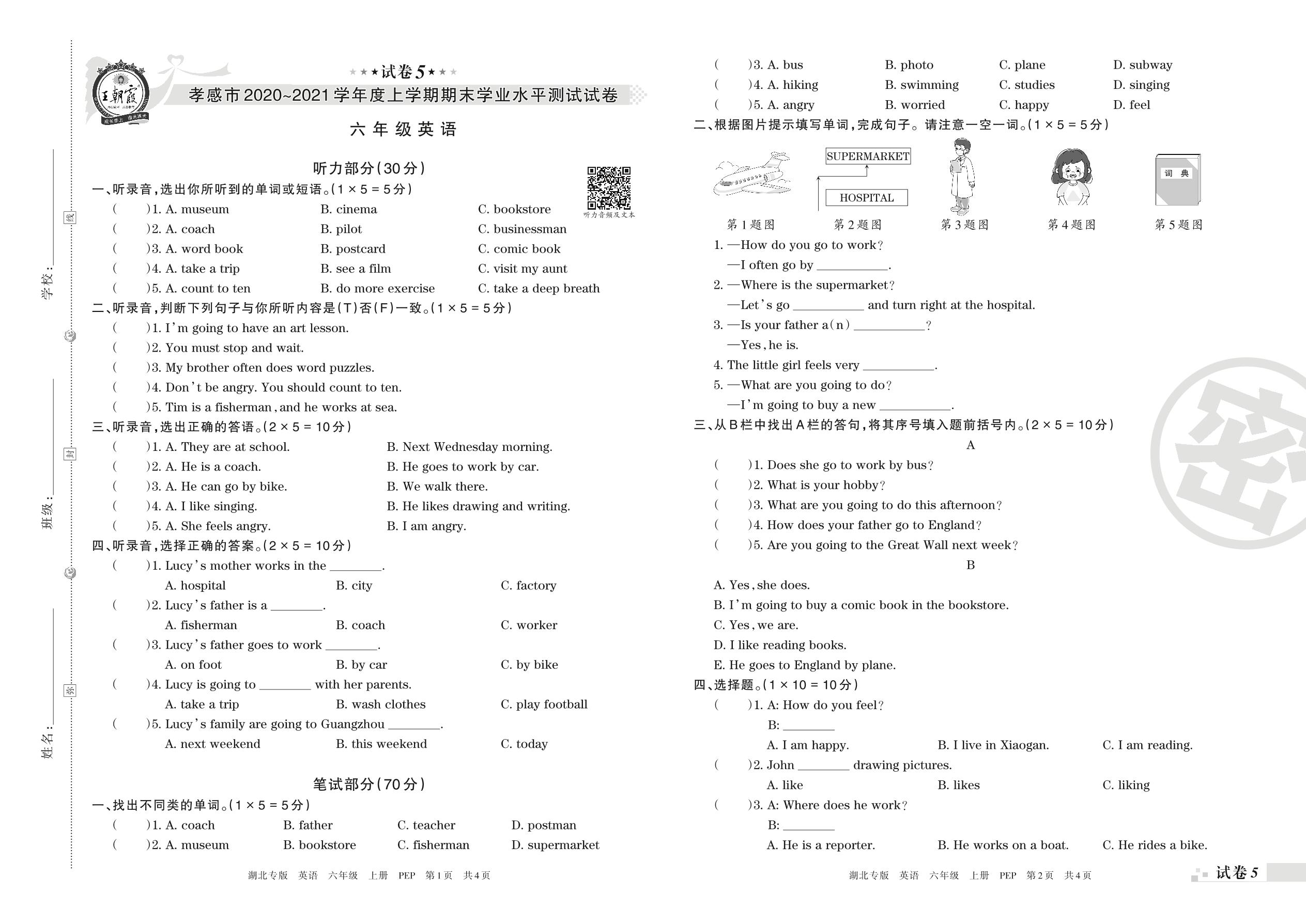 孝感市2020~2021学年度上学期期末学业水平测试试卷六年级英语(人教PEP版)【5】