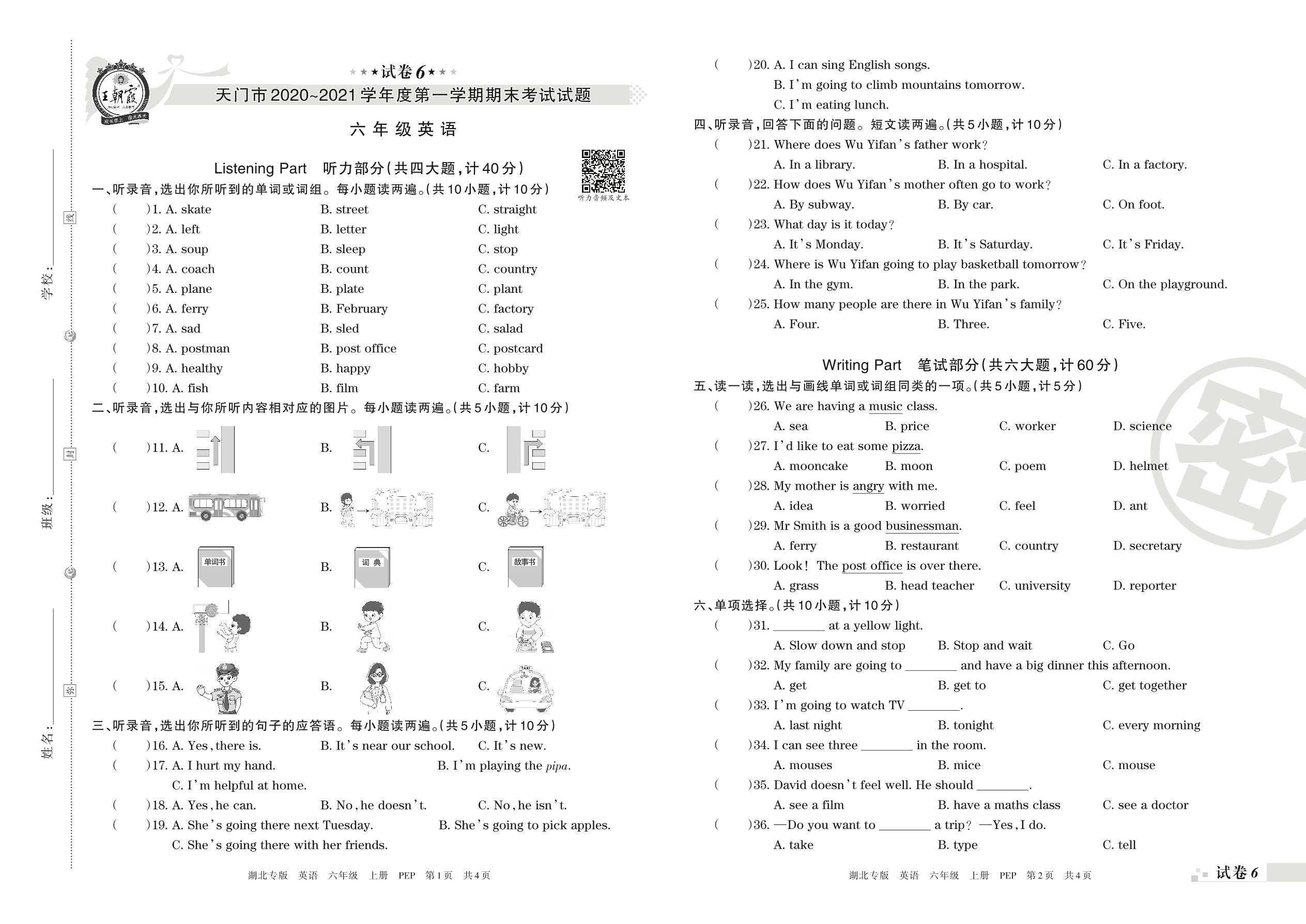 天门市2020~2021学年度第一学期期末考试试题六年级英语(人教PEP版)【6】