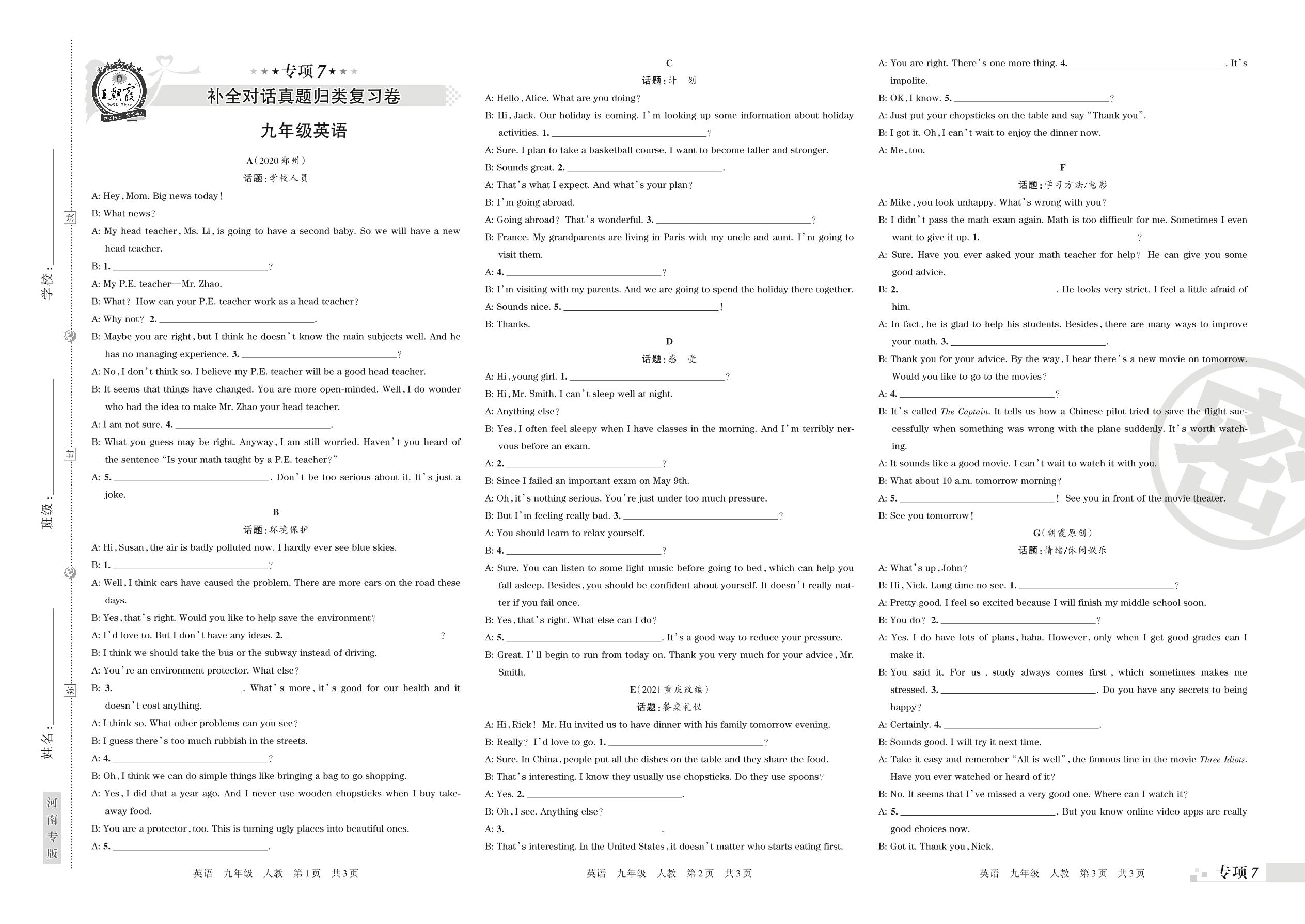 2021-2022学年第一学期王朝霞期末专项卷——补全对话真题归类复习卷九年级英语(人教版)【7】