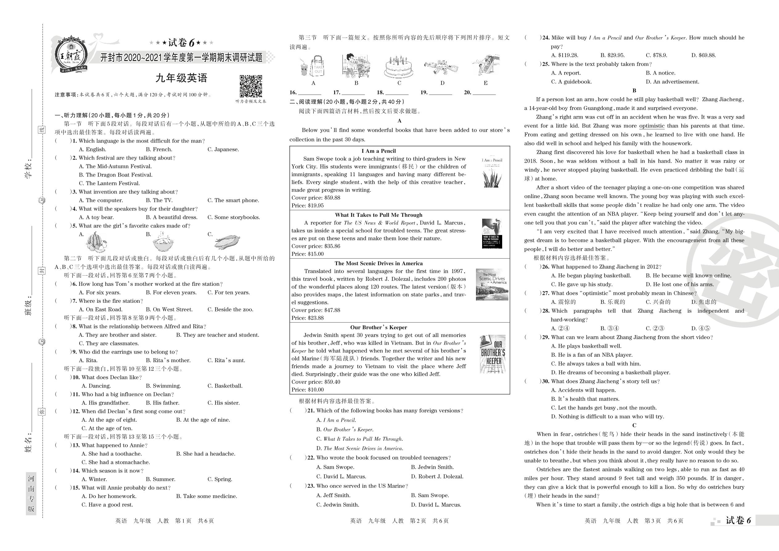 开封市2020~2021学年度第一学期期末调研试题九年级英语(人教版)【6】