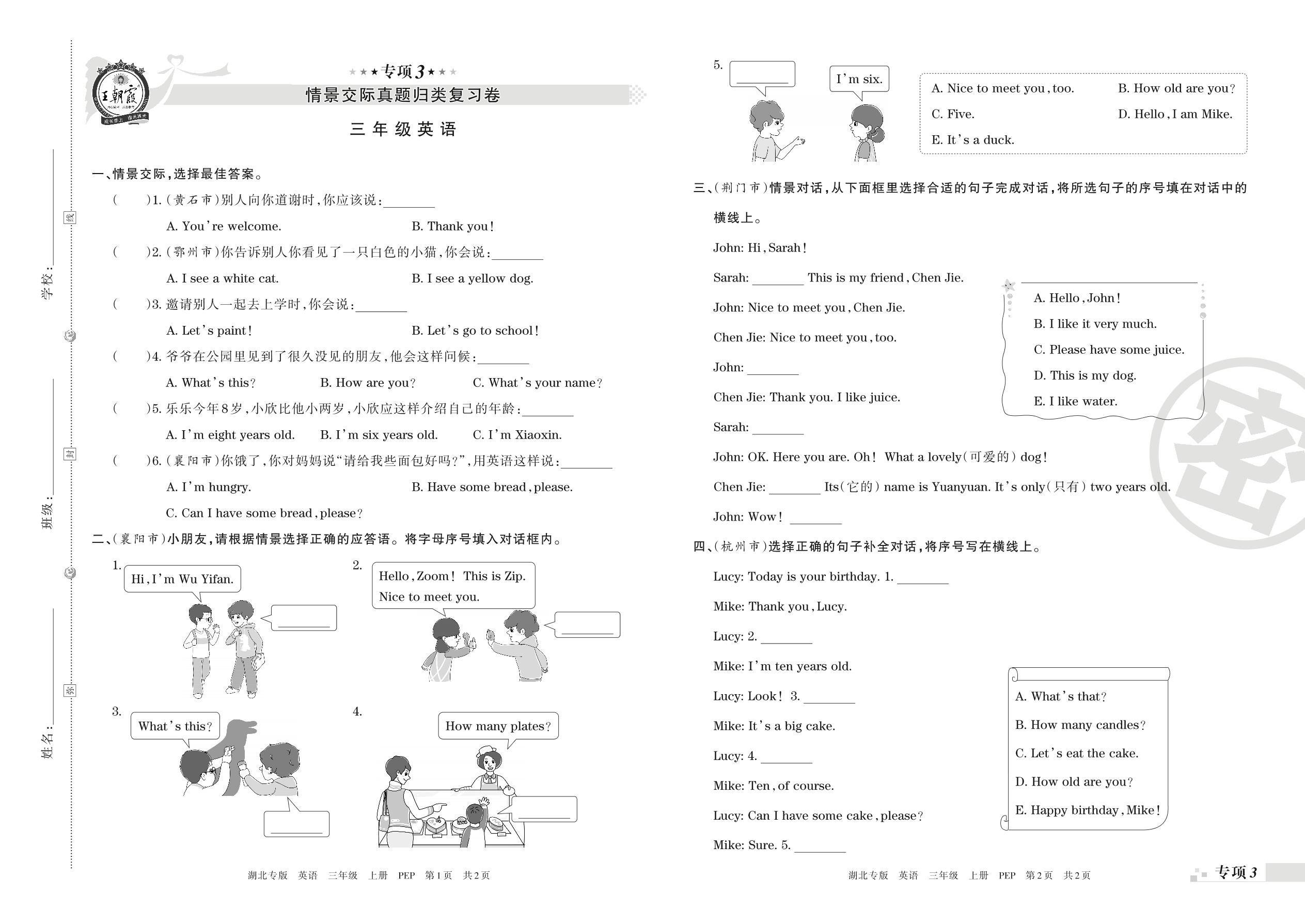 王朝霞期末专项卷——情景交际真题归类复习卷三年级上册英语(人教PEP版)【3】