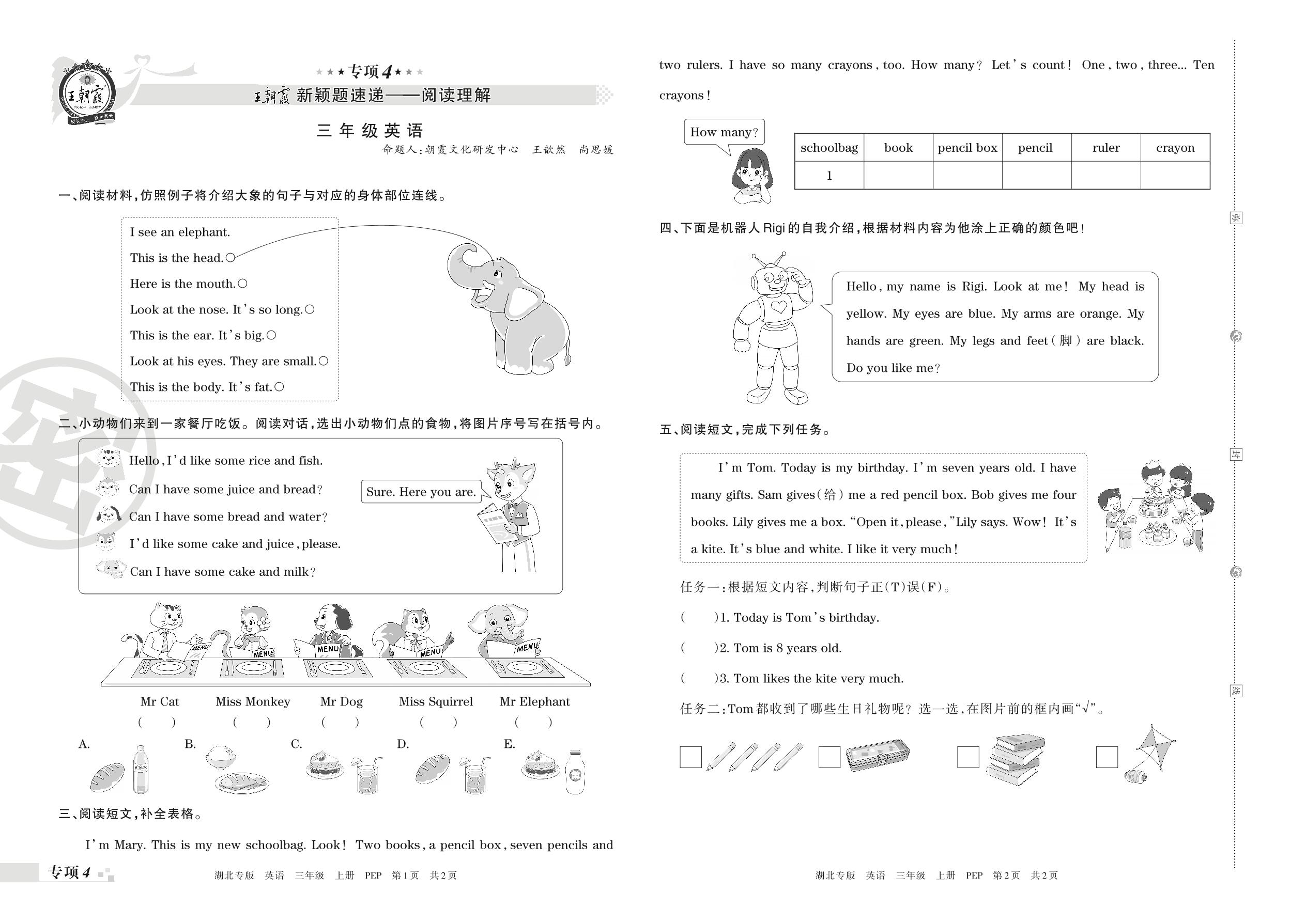 王朝霞期末专项卷——新颖题速递:阅读理解三年级上册英语(人教PEP版)【4】