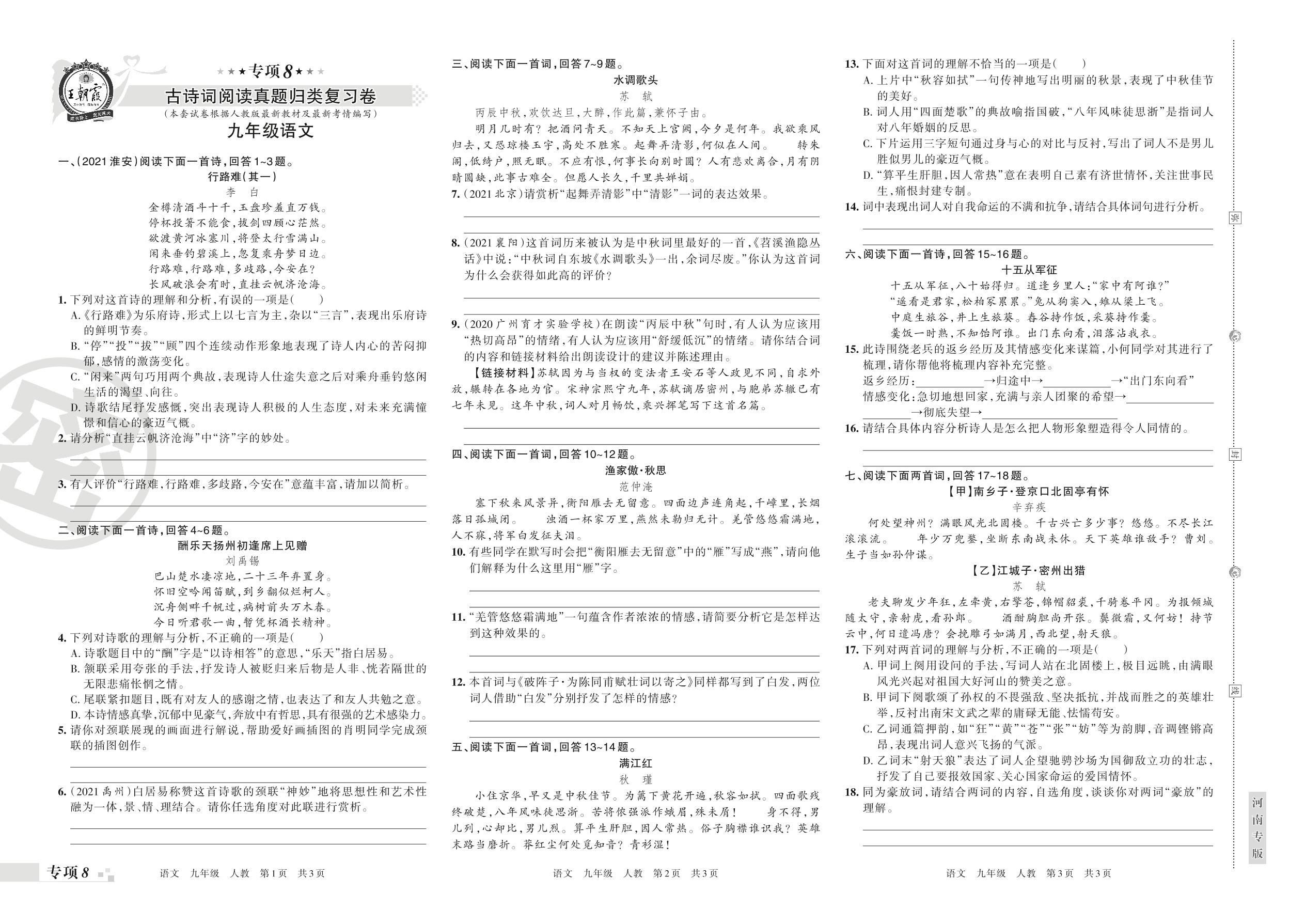 2021-2022学年第一学期王朝霞期末专项卷——古诗词阅读真题归类复习卷九年级语文(人教版)_R211224141714338【8】