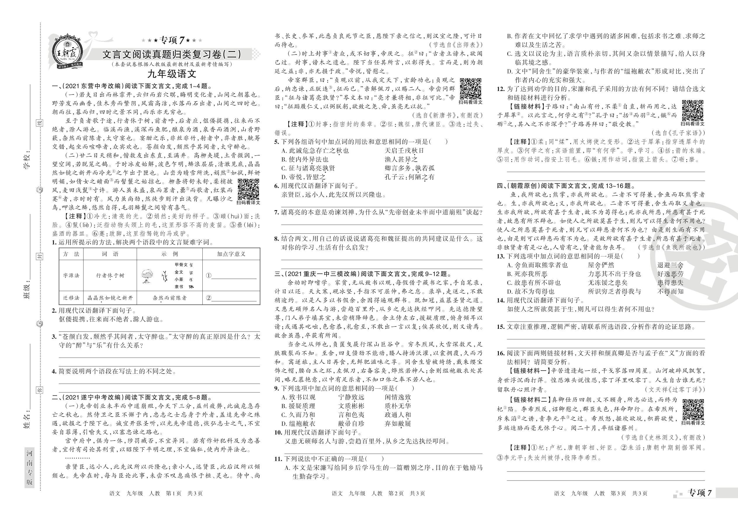 2021-2022学年第一学期王朝霞期末专项卷——文言文阅读真题归类复习卷(二)九年级语文(人教版)【7】