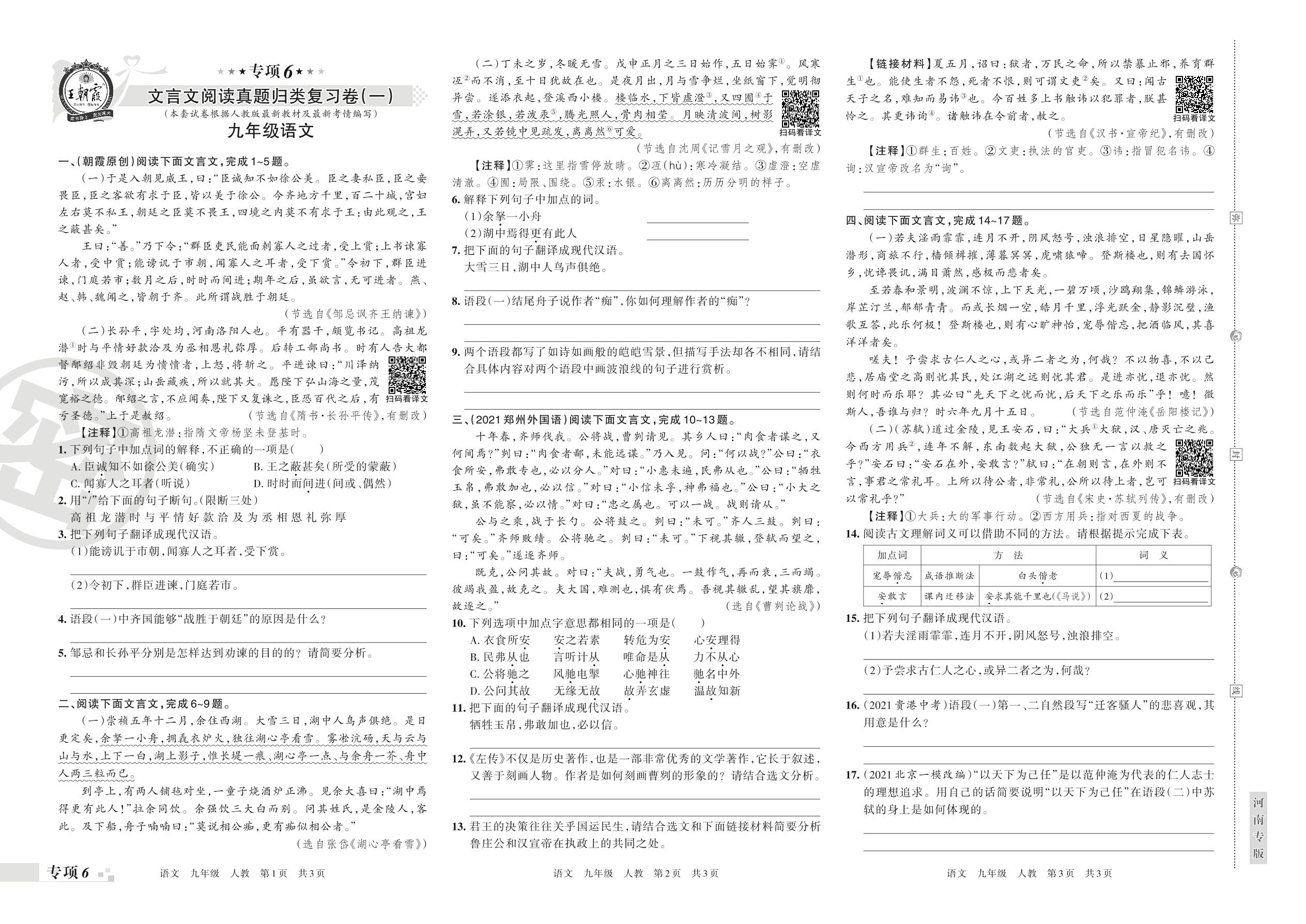 2021-2022学年第一学期王朝霞期末专项卷——文言文阅读真题归类复习卷(一)九年级语文(人教版)【6】