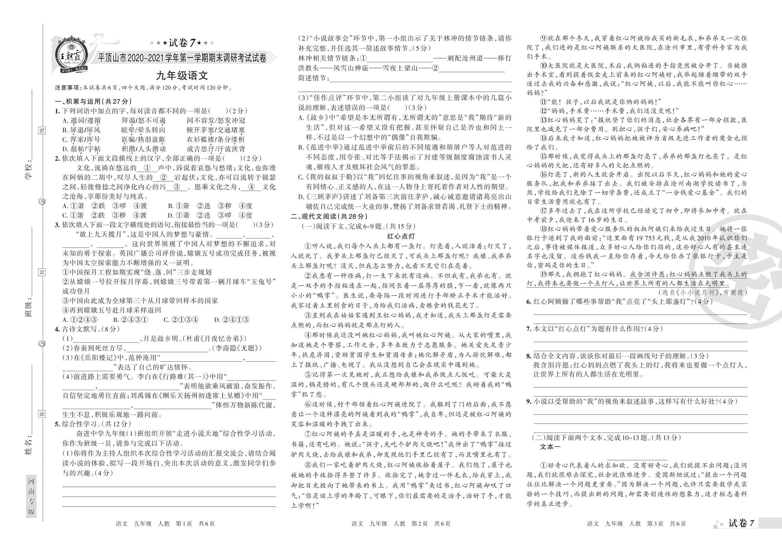 平顶山市2020~2021学年第一学期期末调研考试试卷九年级语文(人教版)【7】