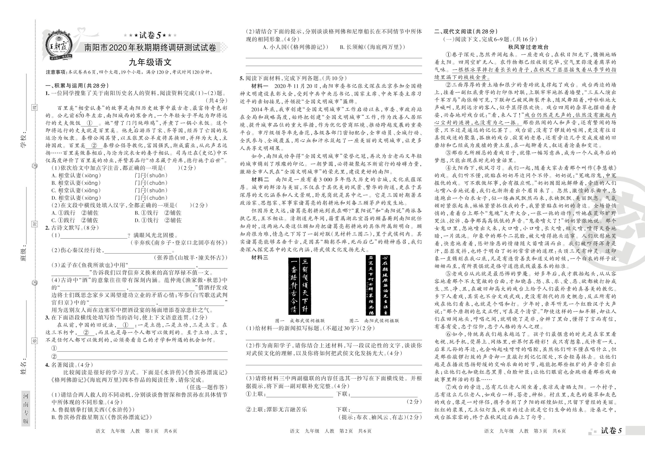 南阳市2020年秋期期终调研测试试卷九年级语文(人教版)【5】