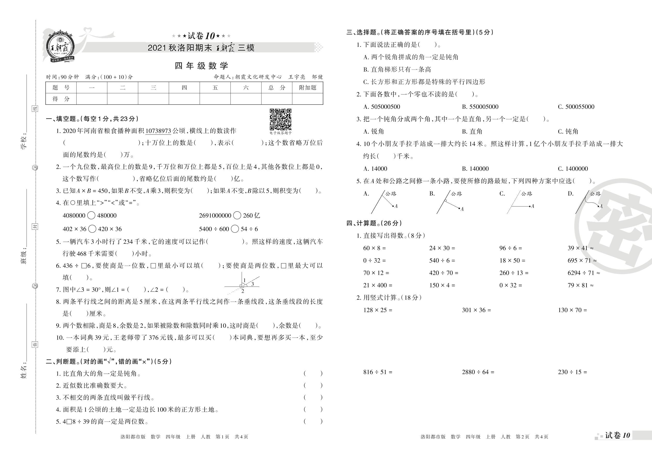 王朝霞期末模拟卷四年级上册数学(人教版)【10】
