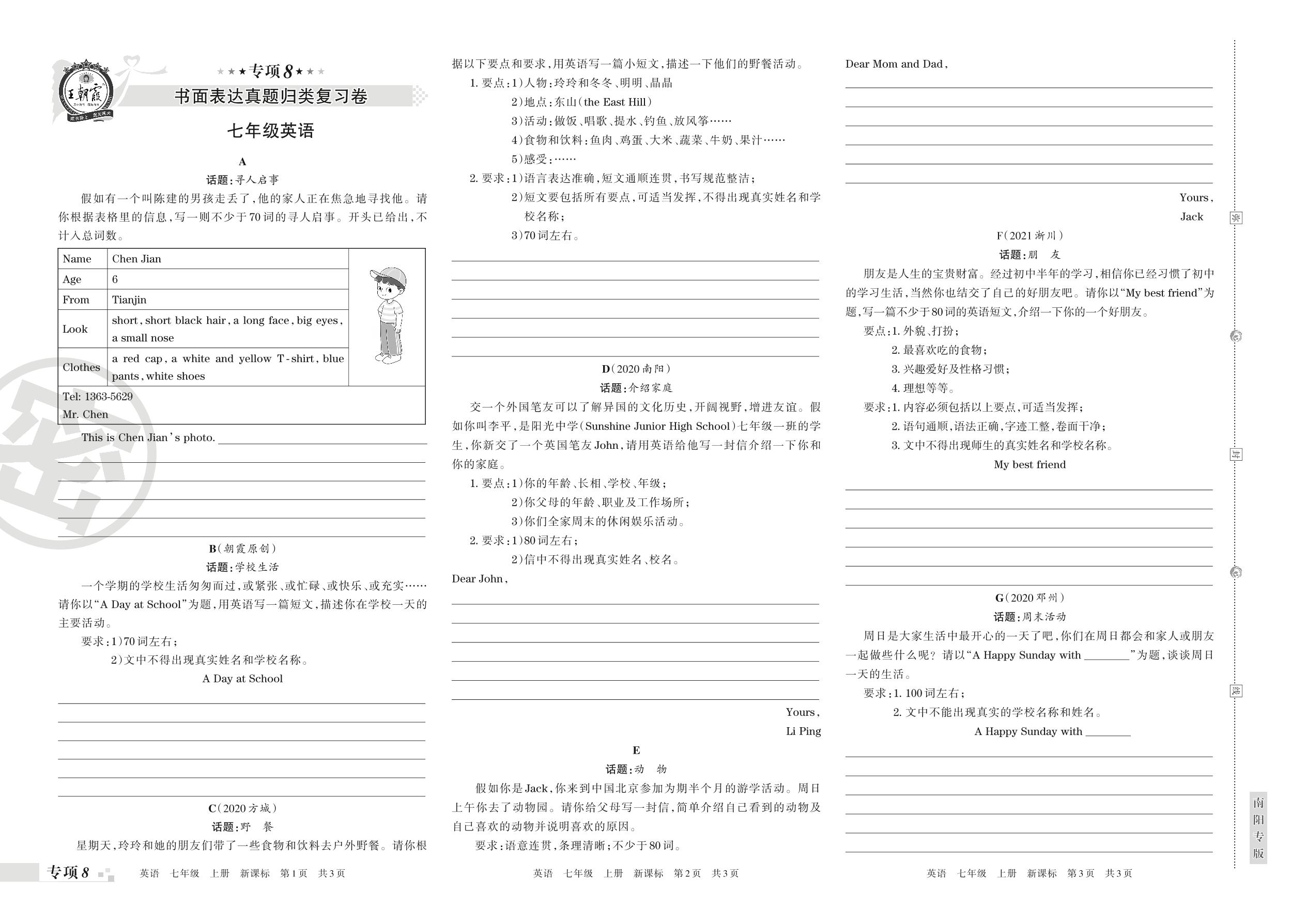 王朝霞期末专项卷——书面表达真题归类复习卷七年级上册英语(新课标版)_R211224141940483【8】