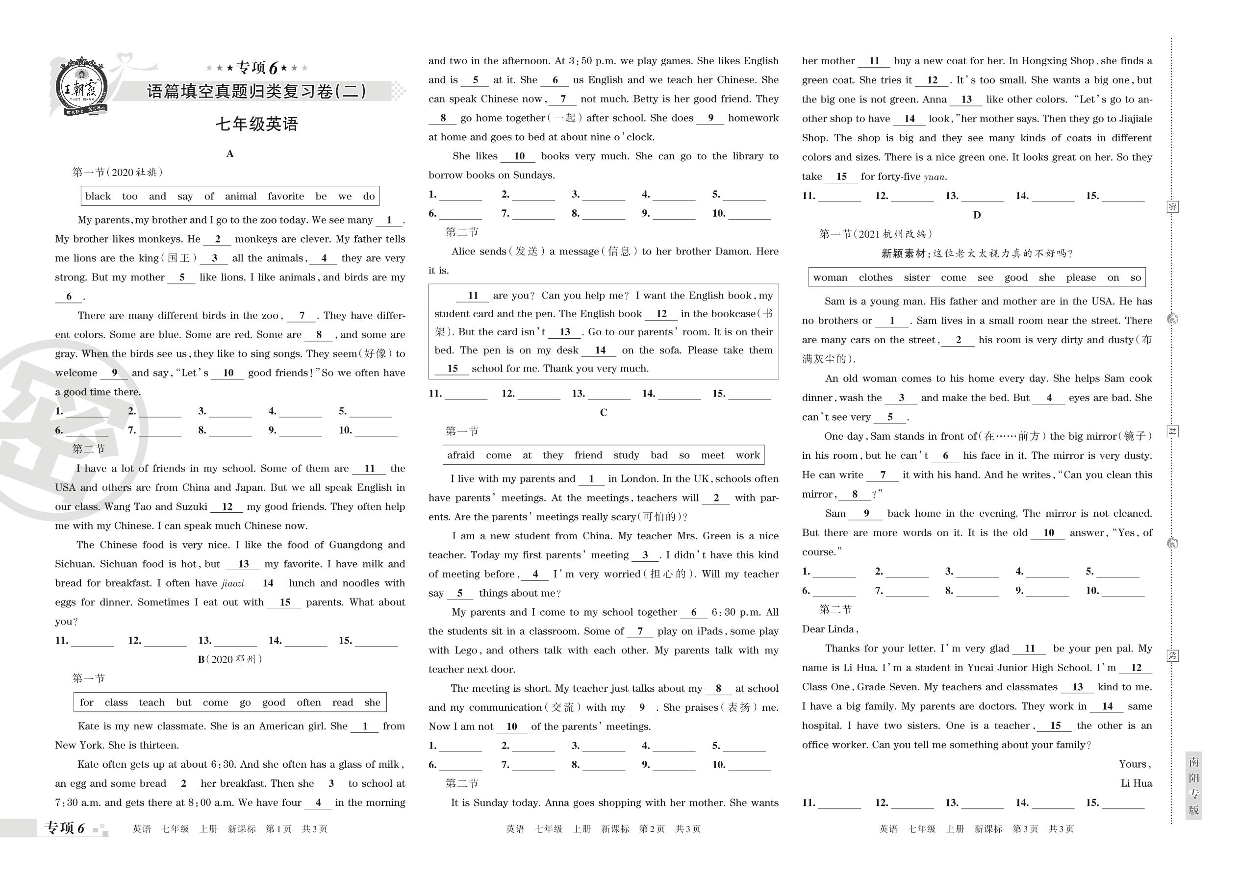 王朝霞期末专项卷——语篇填空真题归类复习卷(二)七年级上册英语(新课标版)_R211224141940756【6】