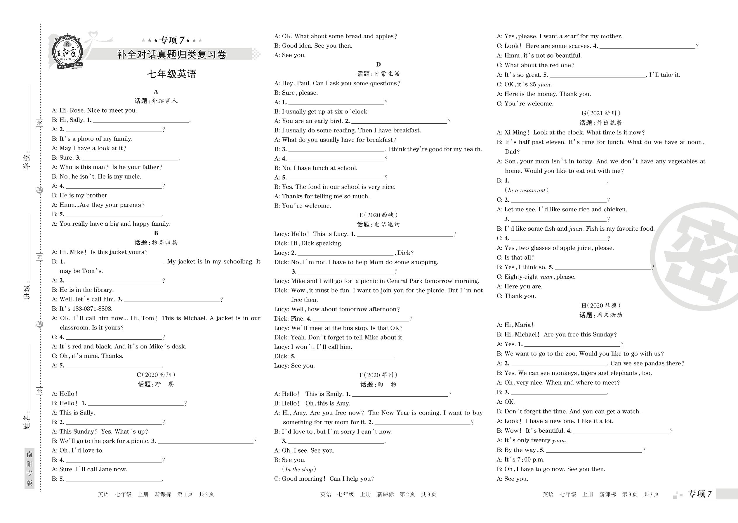 王朝霞期末专项卷——补全对话真题归类复习卷七年级上册英语(新课标版)_R211224141940157【7】