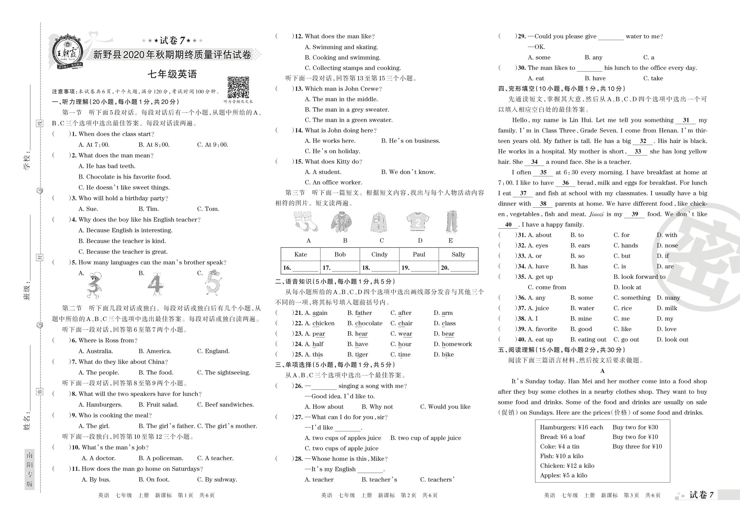 新野县2020年秋期期终质量评估试卷七年级英语(新课标版)【7】